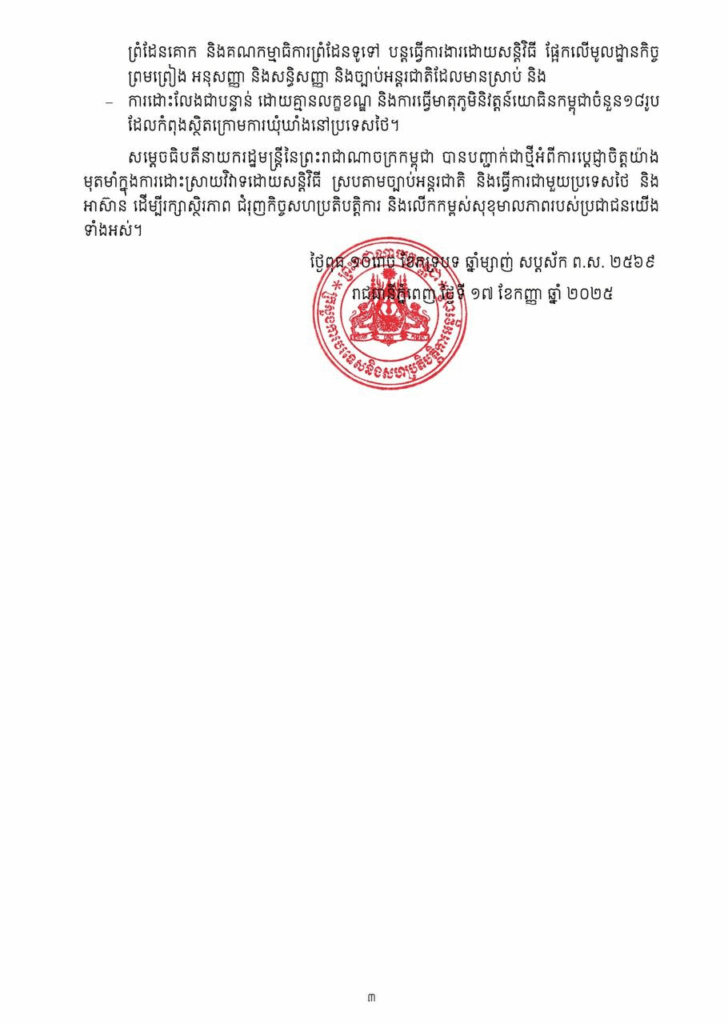 សម្តេចធិបតី ហ៊ុន ម៉ាណែត បានបញ្ជាក់ជាថ្មីអំពីការប្តេជ្ញាចិត្តយ៉ាងមុតមាំក្នុងការដោះស្រាយវិវាទដោយសន្តិវិធី ស្របតាមច្បាប់អន្តរជាតិ និងធ្វើការជាមួយប្រទេសថៃ និងអាស៊ាន ដើម្បីរក្សាស្ថិរភាព ជំរុញកិច្ចសហប្រតិបត្តិការ និងលើកកម្ពស់សុខុមាលភាពរបស់ប្រជាជនយើងទាំងអស់៕