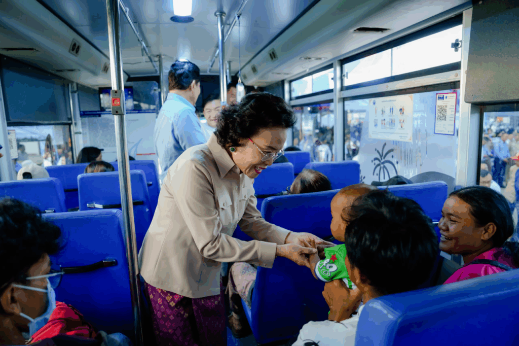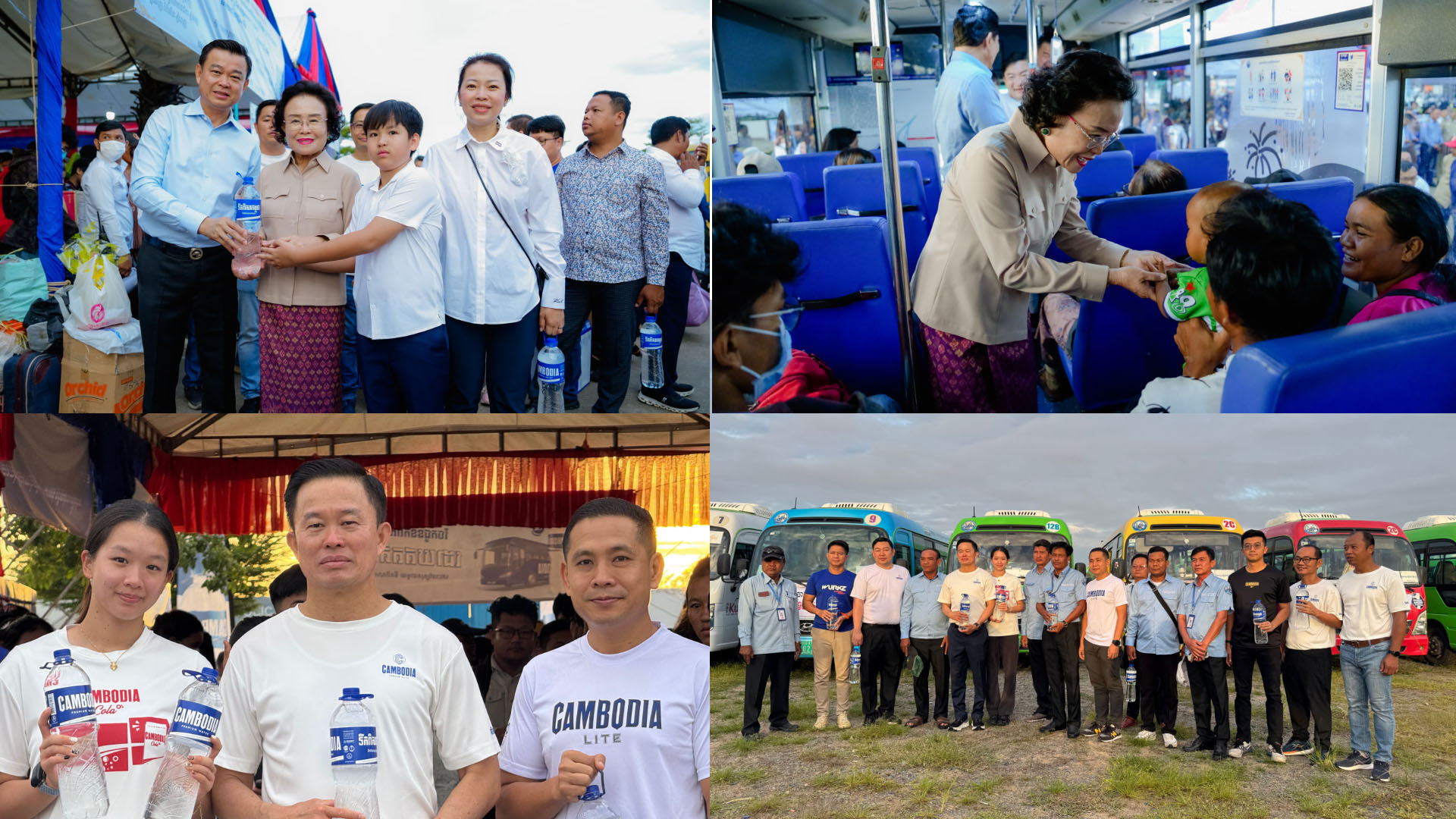 យុទ្ធនាការចុះចែកជូនទឹកពិសាកម្ពុជា ចំណុះ 1.5L ពីសំណាក់ថ្នាក់ដឹកនាំកំពូល ជីប ម៉ុង  ដែលជាការសហការជាមួយរដ្ឋបាលសាលារាជធានីភ្នំពេញ ឆ្នាំនេះ ពិតជាពិសេសលើសឆ្នាំមុនៗ ព្រោះថា បងប្អូនអ្នកដំណើរ ក្រៅតែពីបានជិះរថយន្តក្រុងក្នុងម៉ាស៊ីនត្រជាក់ ដោយឥតគិតថ្លៃទាំងទៅទាំងមកហើយ ថែមទាំងបានកាន់ទឹកពិសាកម្ពុជាចំណុះ១,៥លីត្រ ម្នាក់១ដប ម្នាក់១ដប គ្រប់គ្នា ដែលនេះពិតជាបង្ហាញនូវ ស្មារតីខ្មែរ ស្រឡាញ់ខ្មែរ ខ្មែររួបរួមគ្នា និងការយកចិត្តទុកដាក់ខ្ពស់របស់ថ្នាក់ដឹកនាំ និងសាលារាជធានីភ្នំពេញ ព្រមទាំងក្រុមហ៊ុនឯកជន ចំពោះបងប្អូនជនរួមជាតិខ្មែរ។