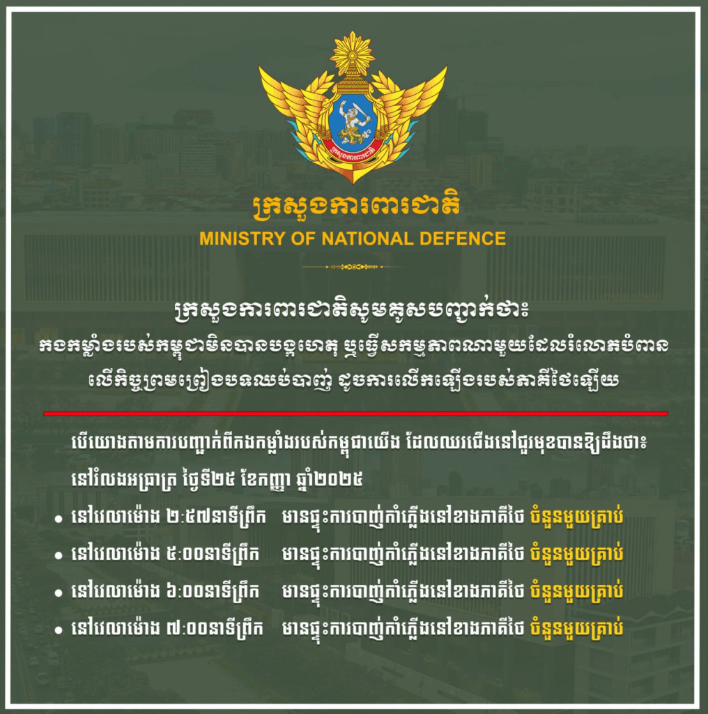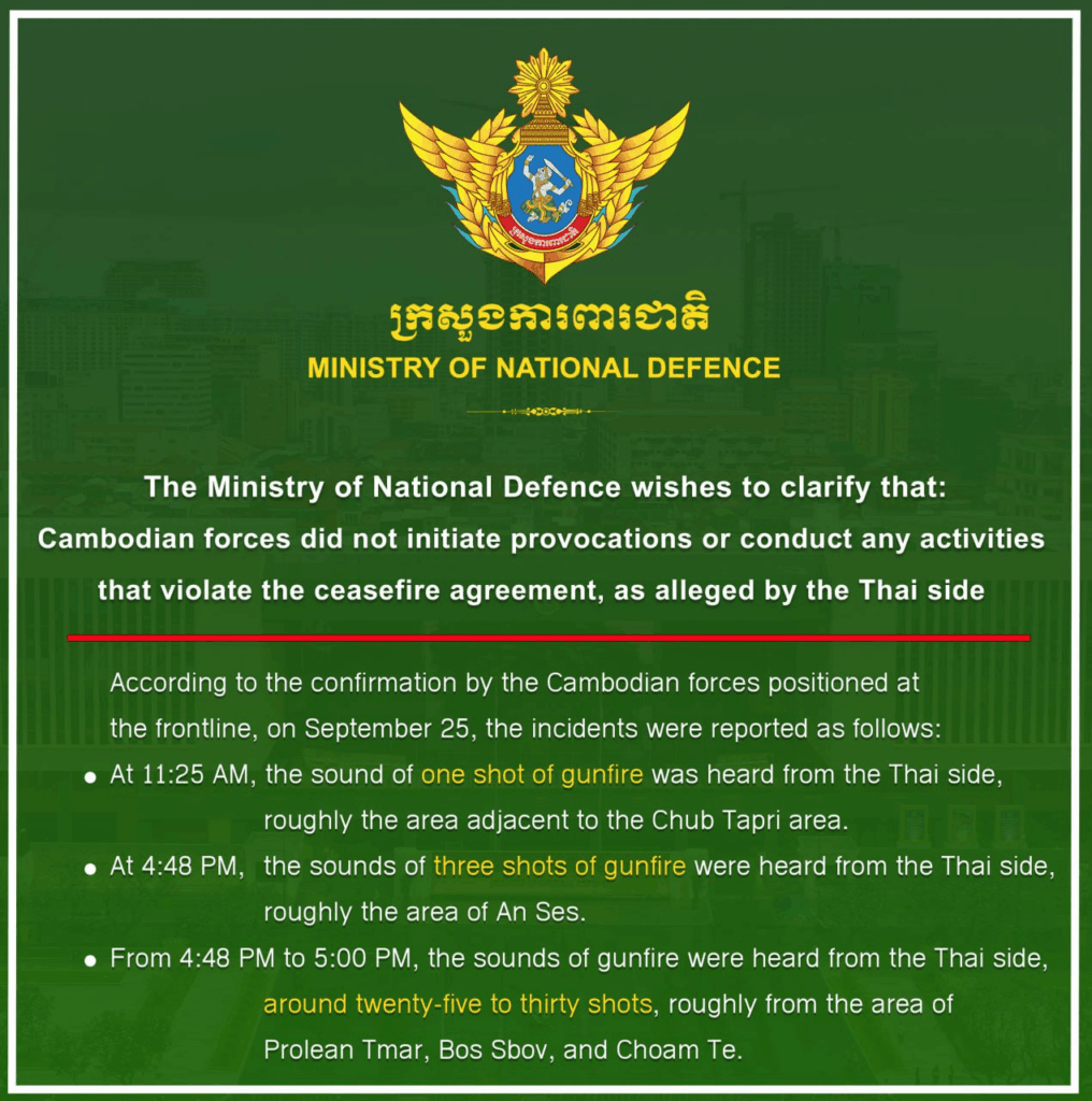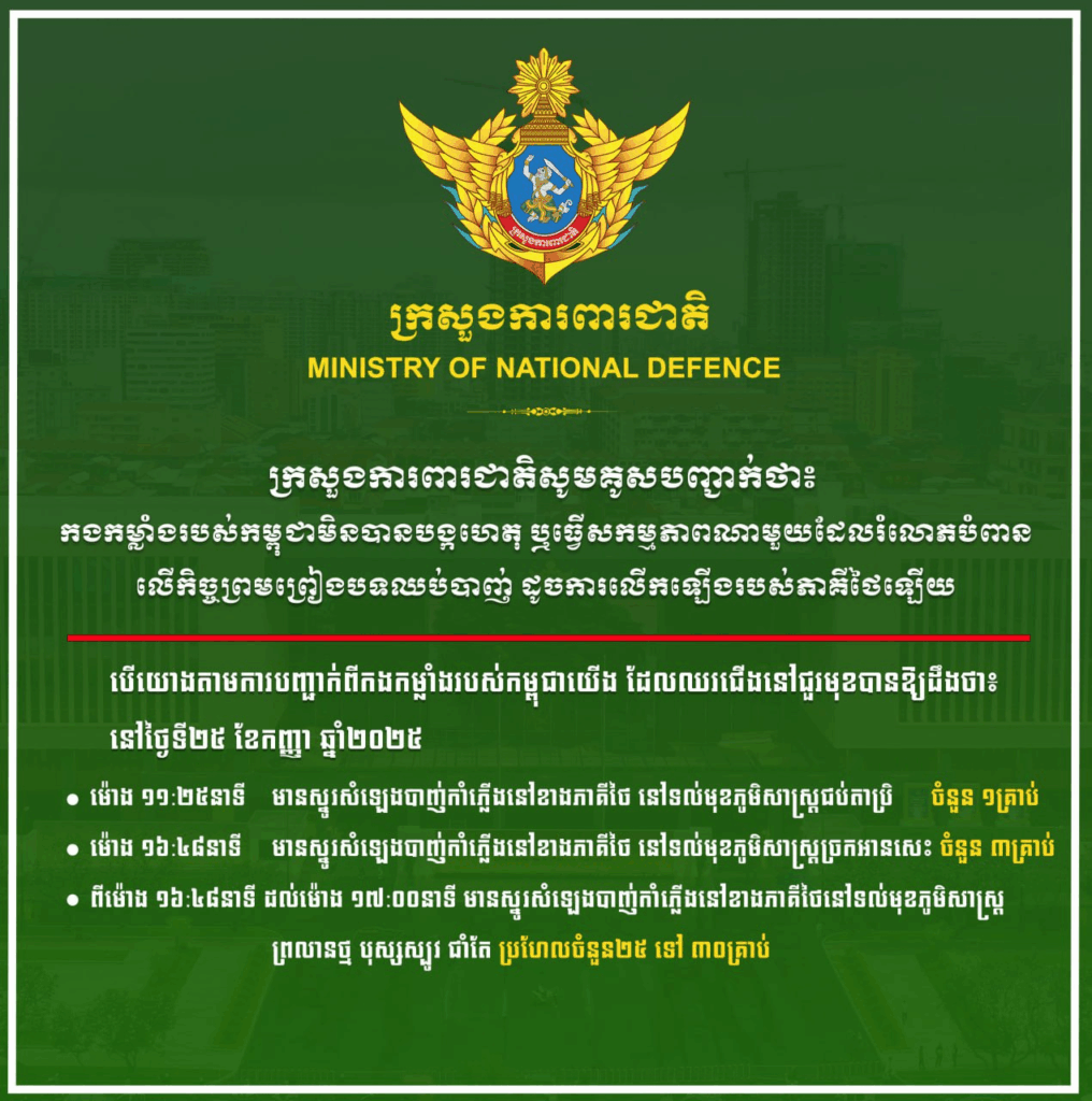 យោងតាមសេចក្ដីប្រកាសព័ត៌មានរបស់ក្រសួងការពារជាតិ នៅថ្ងៃទី២៥ ខែកញ្ញា ឆ្នាំ២០២៥នេះ បានឱ្យដឹងថា គិតចាប់ពីរំលងអាធ្រាត្រថ្ងៃទី២៥ ខែកញ្ញា រហូតដល់ម៉ោង ៥ល្ងាច កងកម្លាំងកម្ពុជាបានឮស្នូរផ្ទុះការបាញ់កាំភ្លើងនៅខាងភាគីថៃប្រមាណ ៣៣ ឬ៣៨គ្រាប់។