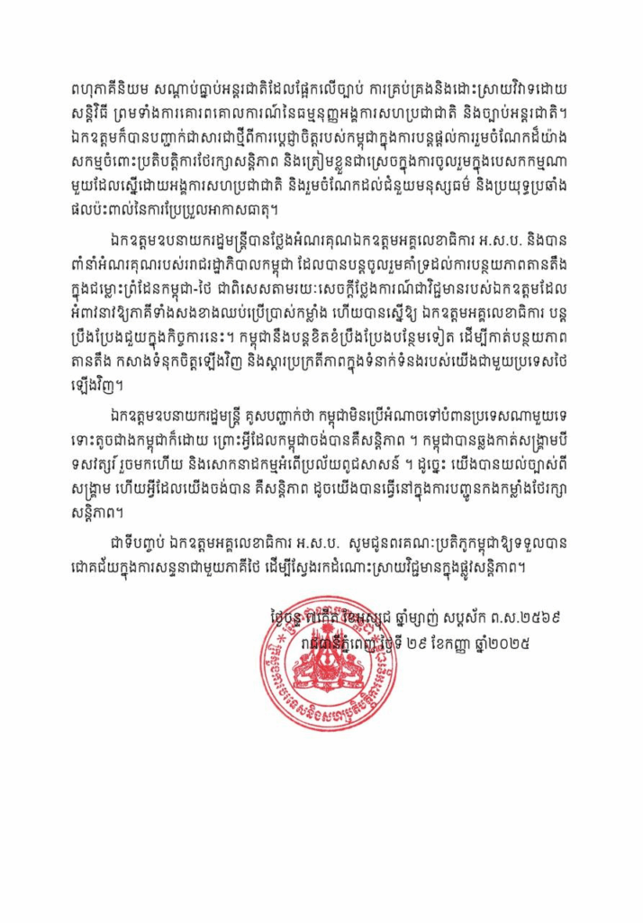 ពាំនាំអំណរគុណរបស់ររាជរដ្ឋាភិបាលកម្ពុជា ដែលបានបន្តចូលរួមគាំទ្រដល់ការបន្ថយភាពតានតឹង ក្នុងជម្លោះព្រំដែនកម្ពុជា-ថៃ ជាពិសេសតាមរយៈសេចក្ដីថ្លែងការណ៍ជាវិជ្ជមានរបស់ឯកឧត្តមដែល អំពាវនាវឱ្យភាគីទាំងសងខាងឈប់ប្រើប្រាស់កម្លាំង ហើយបានស្នើឱ្យ ឯកឧត្តមអគ្គលេខាធិការ បន្តប្រឹងប្រែងជួយក្នុងកិច្ចការនេះ។ កម្ពុជានឹងបន្តខិតខំប្រឹងប្រែងបន្ថែមទៀត ដើម្បីកាត់បន្ថយភាពតានតឹង កសាងទំនុកចិត្តឡើងវិញ និងស្ដារប្រក្រតីភាពក្នុងទំនាក់ទំនងរបស់យើងជាមួយប្រទេសថៃឡើងវិញ។