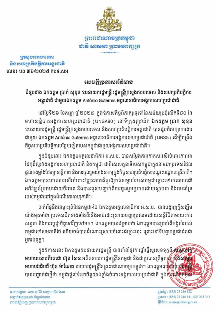 ការបង្ហាញក្ដីសង្ឃឹមនេះរបស់អគ្គលេខាធិការអង្គការសហប្រជាជាតិ ធ្វើឡើងនៅក្នុងឱកាសឯកឧត្តម ប្រាក់ សុខុន ឧបនាយករដ្ឋមន្ត្រី រដ្ឋមន្ត្រីក្រសួងការបរទេស និងសហប្រតិបត្តិការអន្តរជាតិ ជួបពិភាក្សាការងារ ជាមួយ ឯកឧត្តម António Guterres នៅថ្ងៃទី២៦ ខែកញ្ញា ឆ្នាំ២០២៥ ក្នុងឱកាសកិច្ចពិភាក្សាទូទៅនៃសម័យប្រជុំលើកទី៨០ មហាសន្និបាតអង្គការសហប្រជាជាតិ (UNGA80) នៅទីក្រុងញូវយ៉ក។