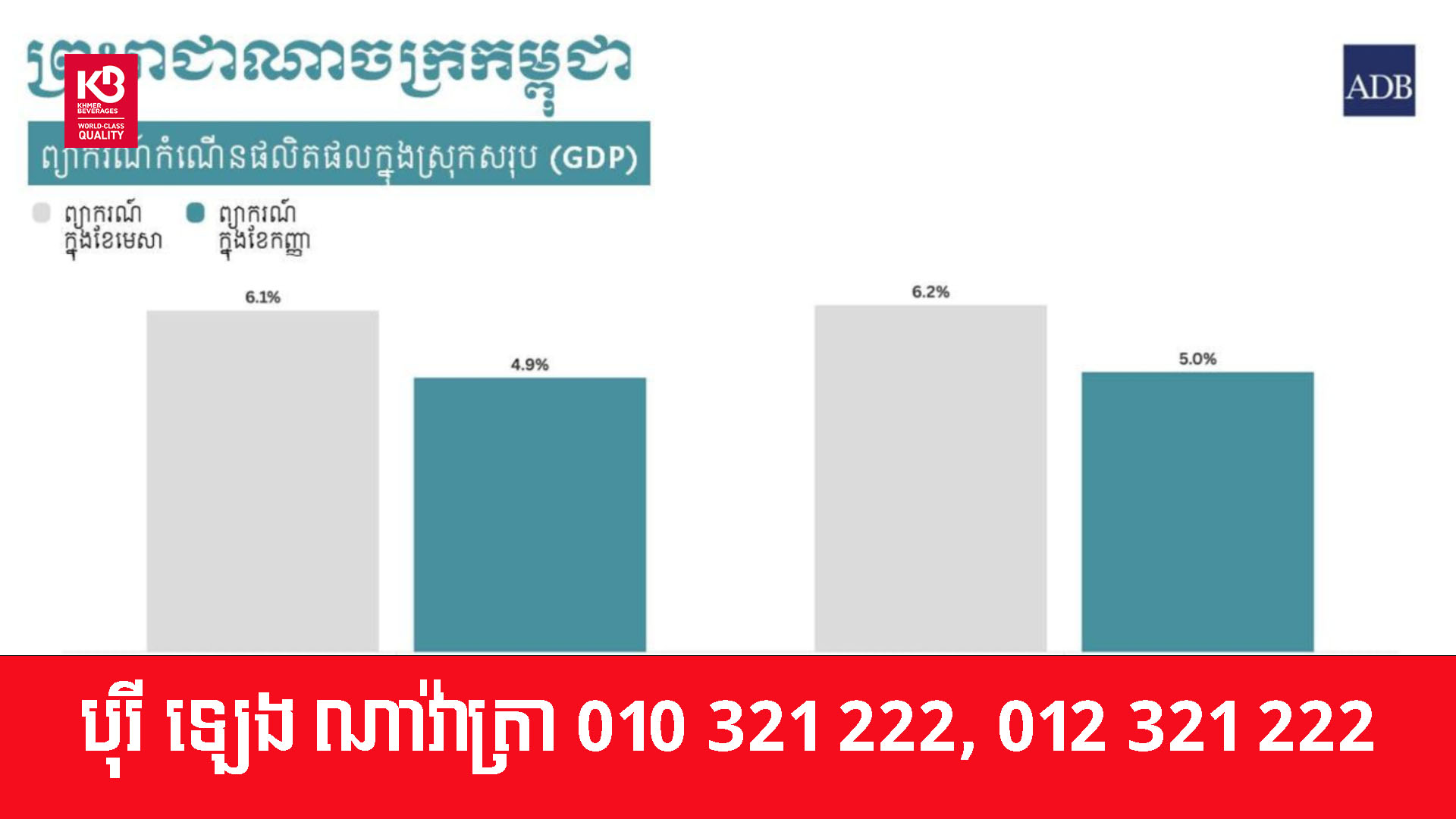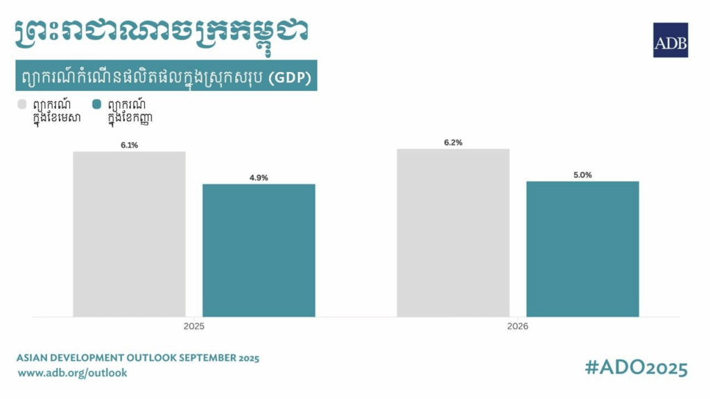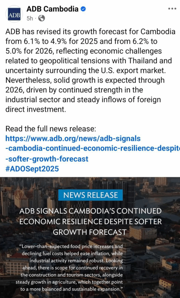 ធនាគារអភិវឌ្ឍន៍អាស៊ី (ADB) បានបន្ថយការព្យាករកំណើនសេដ្ឋកិច្ចសម្រាប់កម្ពុជាពី៦.១% មក៤.៩% សម្រាប់ឆ្នាំ ២០២៥ ខណៈនិងពី៦.២% មក៥.០% សម្រាប់ឆ្នាំ២០២៦។ការបន្ទាបការព្យាករនេះ គឺដោយសារឆ្លុះបញ្ចាំងពីបញ្ហាប្រឈមសេដ្ឋកិច្ច ទាក់ទងនឹងភាពតានតឹងភូមិសាស្ត្រនយោបាយជាមួយប្រទេសថៃ និងភាពមិនច្បាស់លាស់ជុំវិញទីផ្សារនាំចេញទៅសហរដ្ឋអាមេរិក។