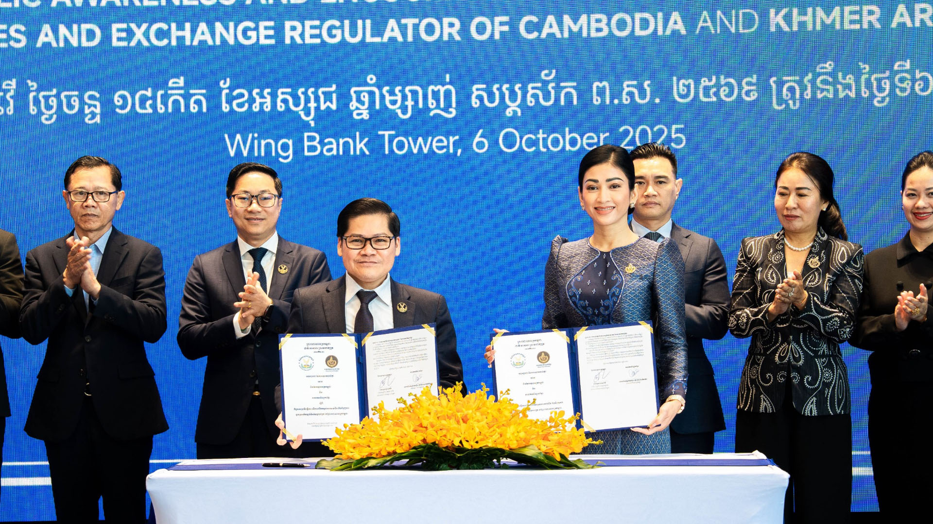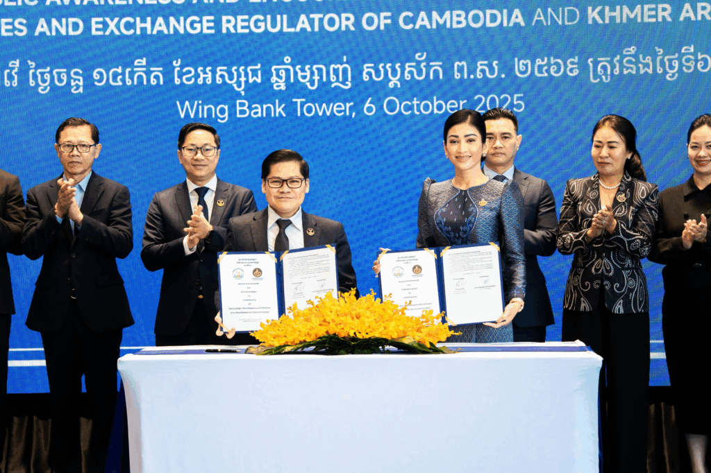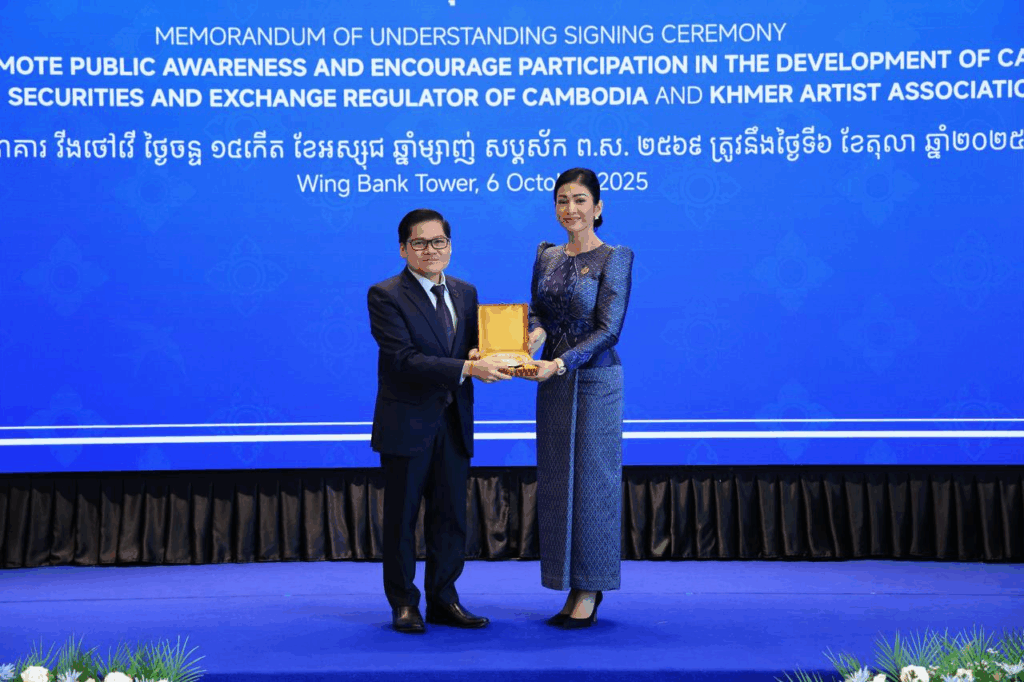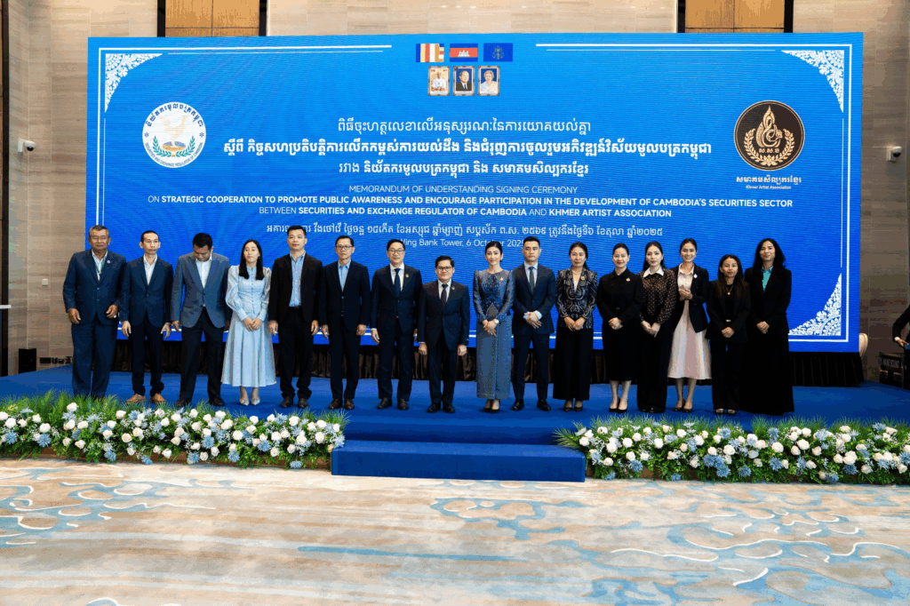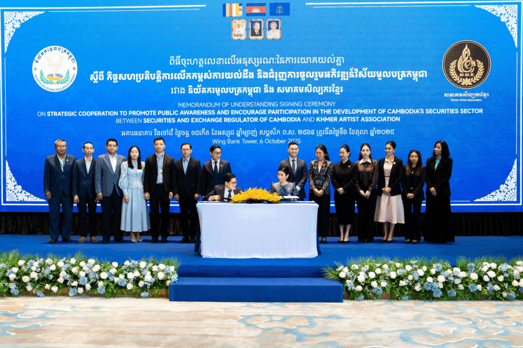 ភ្នំពេញ — កាលពីព្រឹកថ្ងៃទី៦ ខែតុលា ឆ្នាំ ២០២៥ នៅអគារធនាគារ វីងថៅវ័រ សមាគមសិល្បករខ្មែរ និងនិយ័តករមូលបត្រកម្ពុជា បានរៀបចំពិធីចុះអនុស្សរណៈយោគយល់គ្នា ដែលមានគោលបំណងសំខាន់ក្នុងការលើកកម្ពស់ការយល់ដឹង និងជំរុញការចូលរួមអភិវឌ្ឍវិស័យមូលបត្រនៅព្រះរាជាណាចក្រកម្ពុជា។