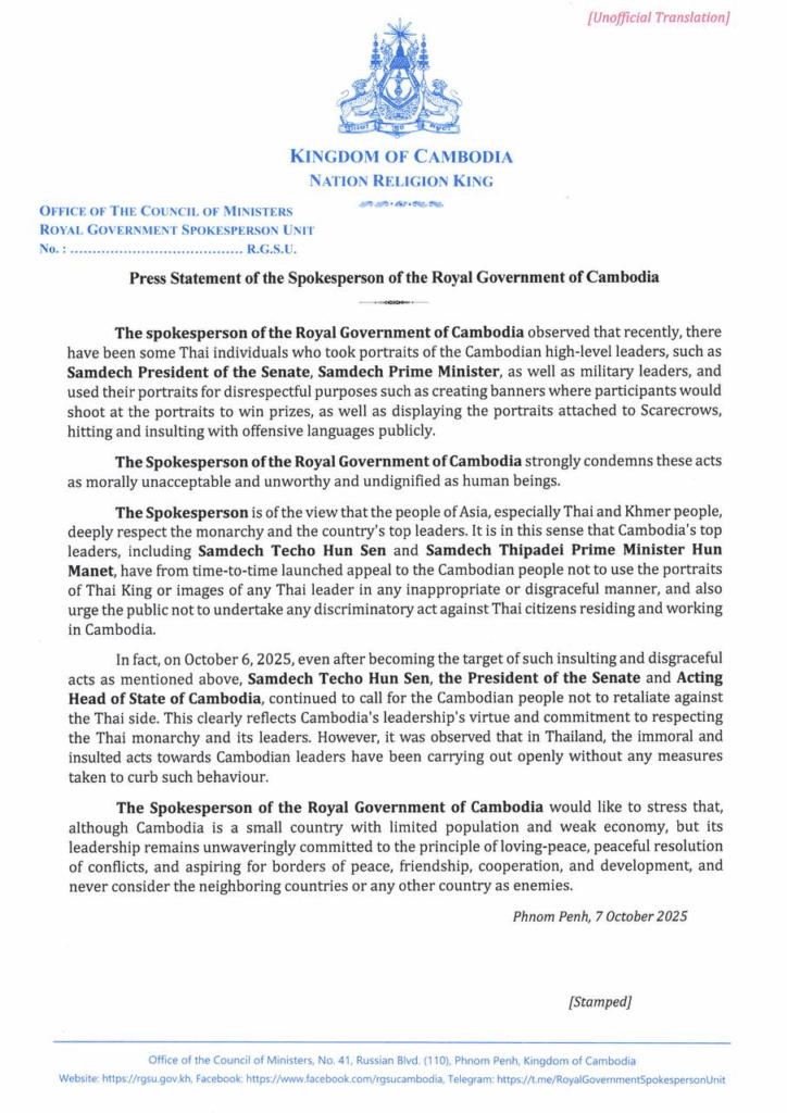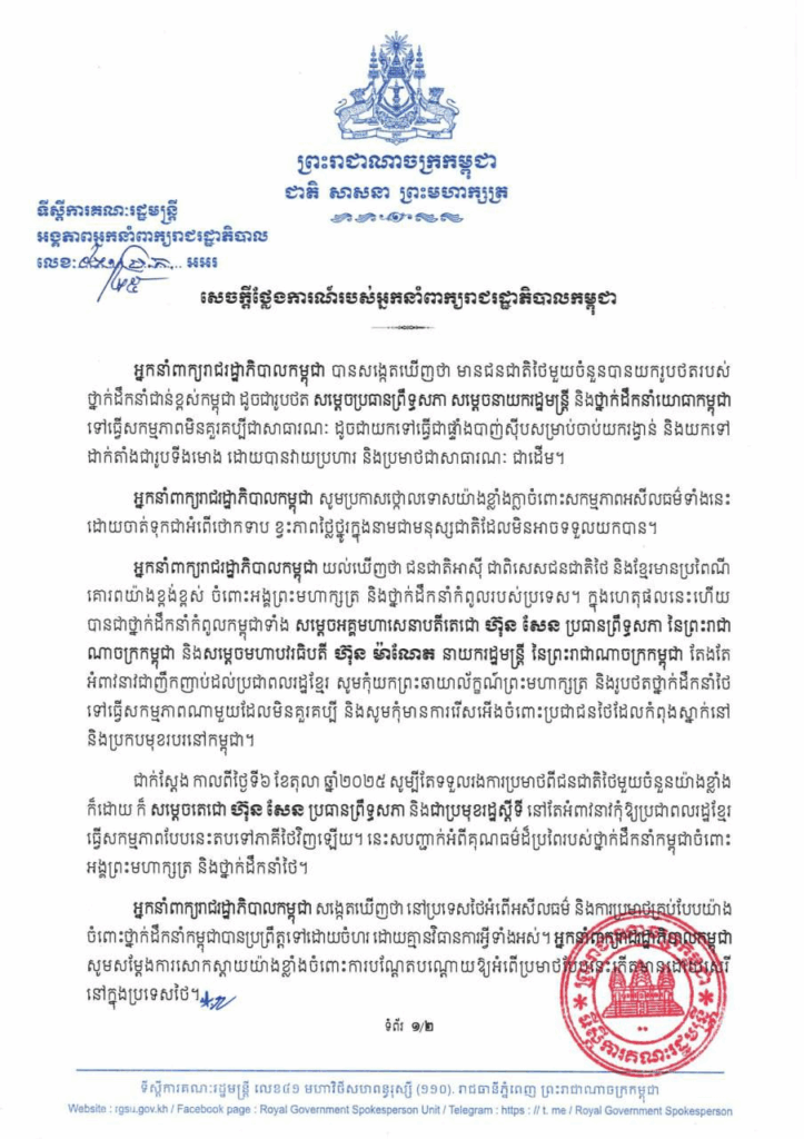 យោងតាមសេចក្តីថ្លែងការណ៍របស់អ្នកនាំពាក្យរាជរដ្ឋាភិបាលកម្ពុជា នាថ្ងៃទី៧ ខែតុលា ឆ្នាំ២០២៥នេះ បានឱ្យដឹងថា អ្នកនាំពាក្យរាជរដ្ឋាភិបាលកម្ពុជា សូមប្រកាសថ្កោលទោសយ៉ាងខ្លាំងក្លាចំពោះសកម្មភាពអសីលធម៌ទាំងនេះ ដោយចាត់ទុកជាអំពើថោកទាប ខ្វះភាពថ្លៃថ្នូរក្នុងនាមជាមនុស្សជាតិដែលមិនអាចទទួលយកបាន។
