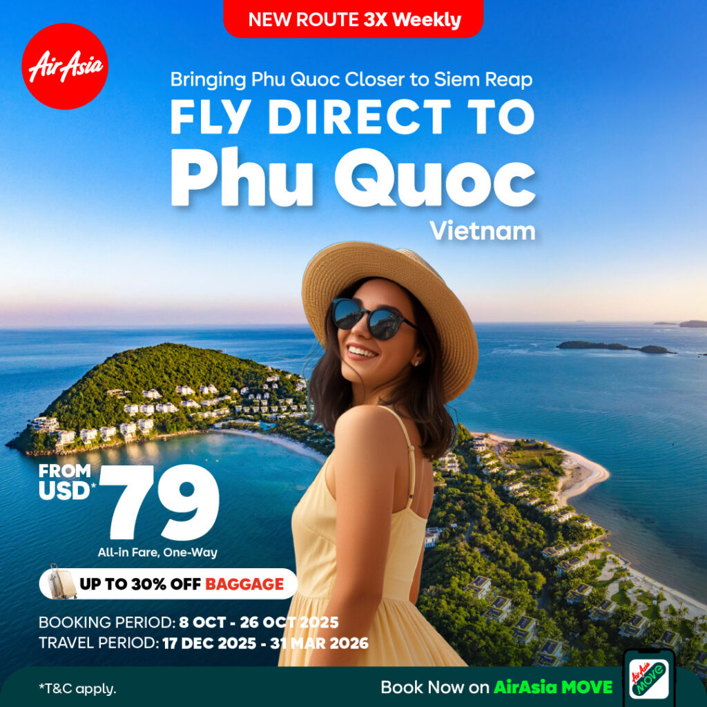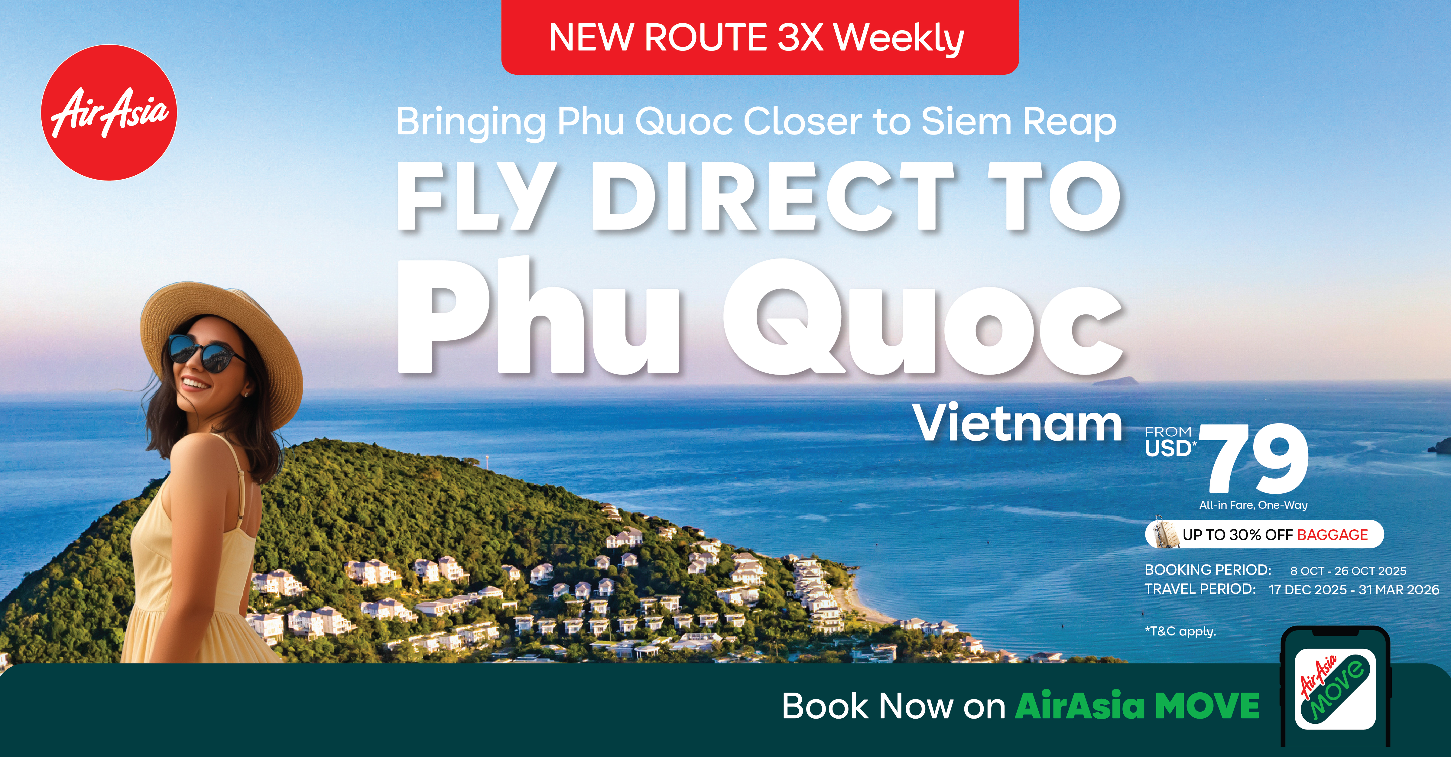 អ៊ែរ អេស៊ា ខេមបូឌា ក្នុងការផ្តល់ជូនការហោះហើរដែលមានតម្លៃសមរម្យព្រមទាំងការតភ្ជាប់ដែលលឿនជាង​មុននិងសេវាកម្មកាន់តែល្អប្រសើរនៅទូទាំងតំបន់។ អ្នកដំណើរ អាចកក់សំបុត្រយន្តហោះចាប់ពីពេលជូន​ដំណឹងនេះ រហូតដល់ថ្ងៃទី ២៦ ខែតុលា ឆ្នាំ ២០២៥ សម្រាប់ការធ្វើដំណើរចាប់ពីថ្ងៃទី ១៧ ខែធ្នូ ឆ្នាំ​២០២៥ ដល់ថ្ងៃទី ៣១ ខែមីនា ឆ្នាំ ២០២៦ តាមរយៈកម្មវិធី AirAsia Move ឬនៅលើគេហទំព័រ airasia.com