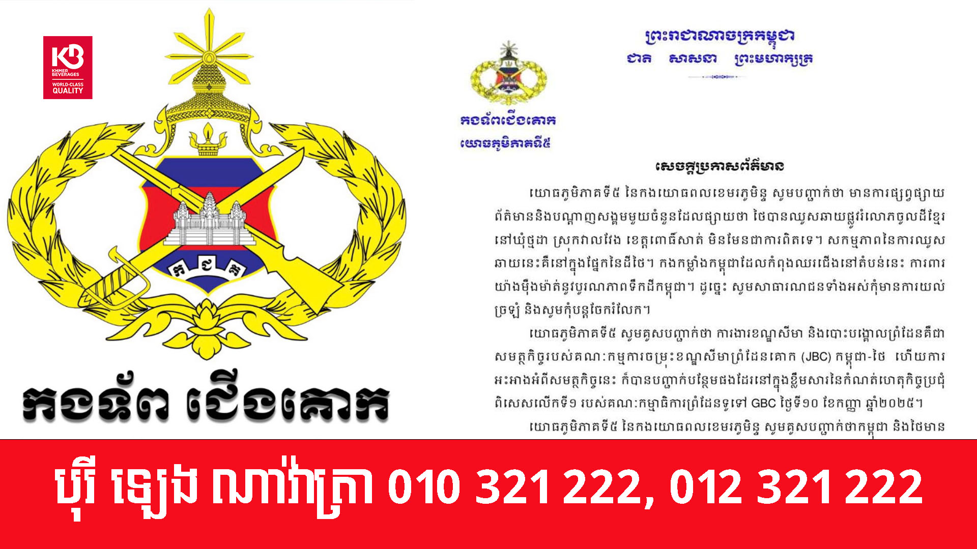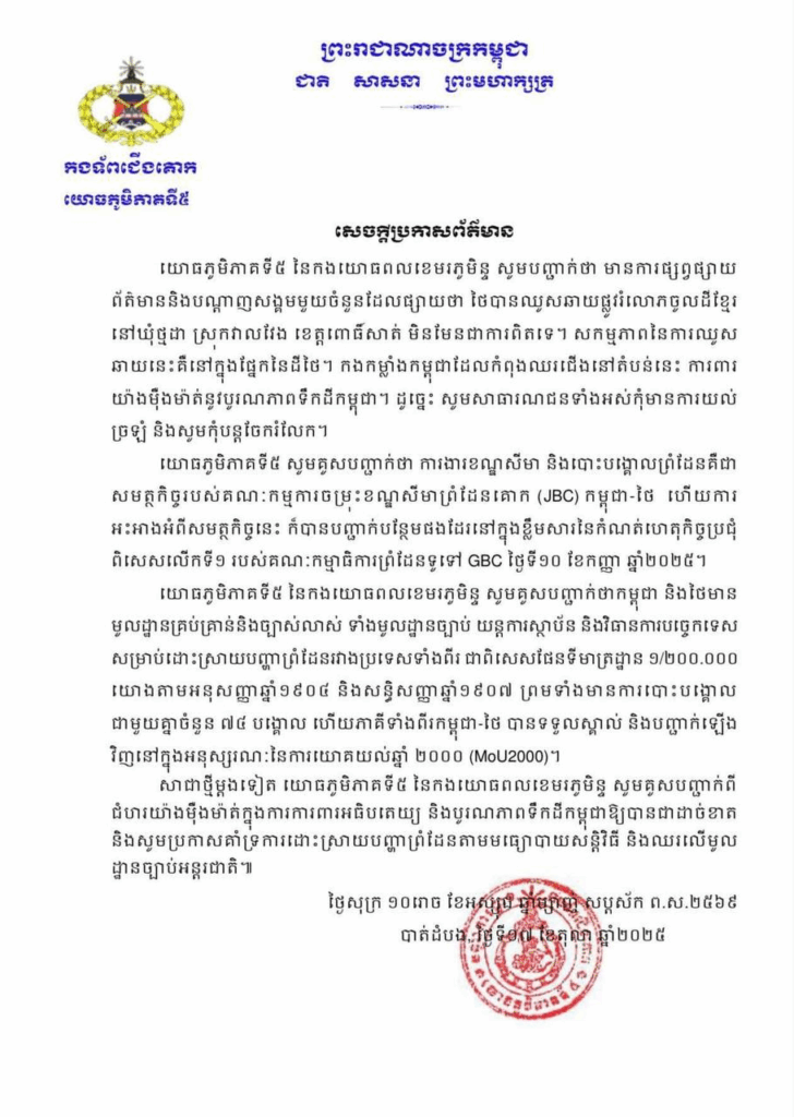 តាមរយៈសេចក្ដីប្រកាសព័ត៌មាន ចុះថ្ងៃទី១៧ ខែតុលា ឆ្នាំ២០២៥ យោធភូមិភាគទី៥ បានសង្កត់ធ្ងន់ថា កងកម្លាំងកម្ពុជាដែលកំពុងឈរជើងនៅតំបន់នេះ ការពារយ៉ាងម៉ឺងម៉ាត់នូវបូរណភាពទឹកដីកម្ពុជា។
