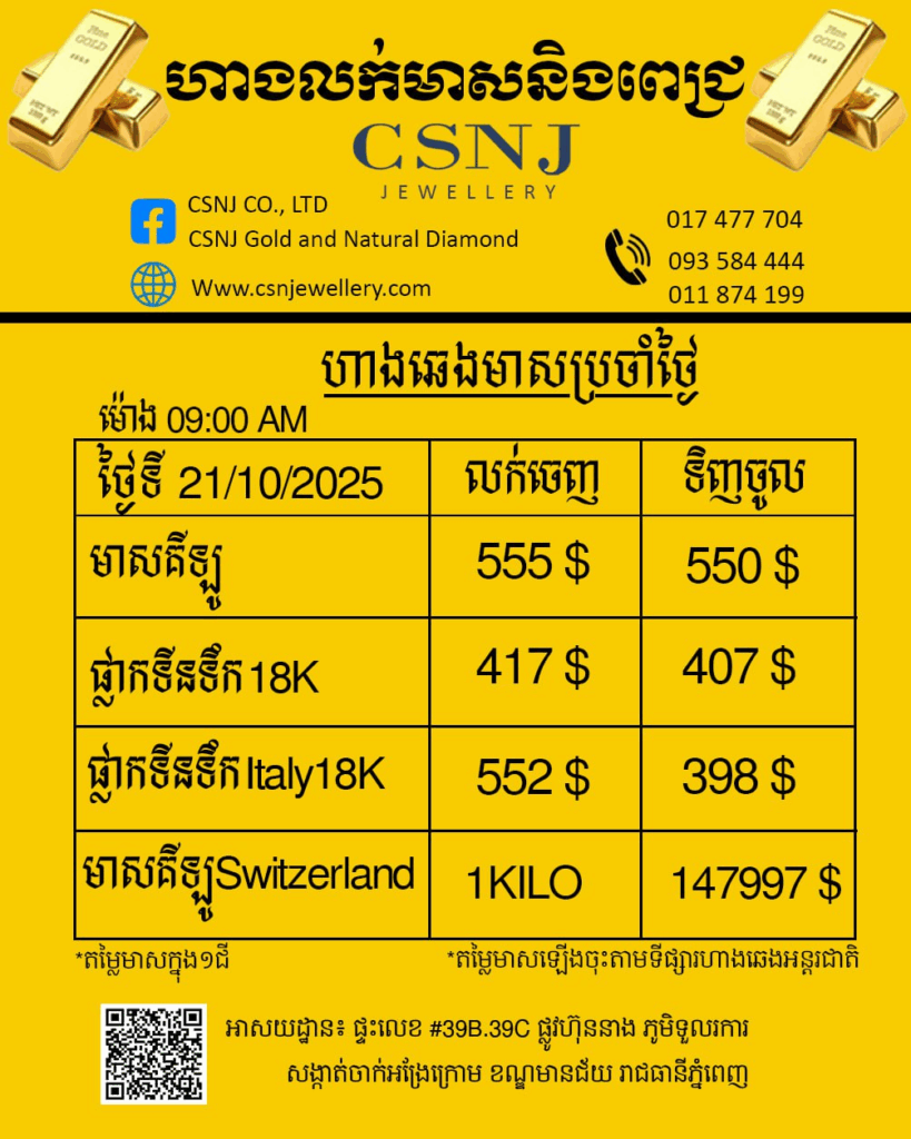 តម្លៃមាសនៅថ្ងៃទី២១ ខែតុលា ឆ្នាំ២០២៥នេះ បានហក់ឡើងខ្ពស់វិញហើយ បើធៀបនឹងថ្ងៃម្សិលមិញ ពោលគឺមានតម្លៃ ៥៥៥ដុល្លារ នៅក្នុងមួយជី ជាតម្លៃលក់ចេញ និងទិញចូលក្នុងតម្លៃ ៥៥០ដុល្លារ។ នេះបើយោងតាមហាងឆេងមាស ពីហាងមាសពេជ្រ CSNJ របស់លោកឧកញ៉ា ចិន សំណាង នាព្រឹកថ្ងៃទី២១ ខែតុលា។