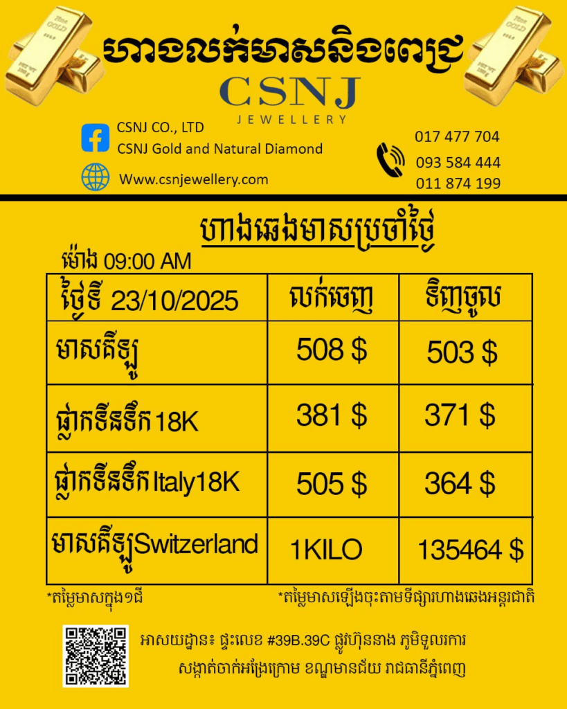 តម្លៃមាសនៅថ្ងៃទី២៣ ខែតុលា ឆ្នាំ២០២៥នេះ បានបន្ដធ្លាក់ថ្លៃទៀតហើយ បើធៀបនឹងព្រឹកថ្ងៃម្សិលមិញ ពោលគឺមានតម្លៃ ៥០៨ដុល្លារ នៅក្នុងមួយជី ជាតម្លៃលក់ចេញ និងទិញចូលក្នុងតម្លៃ ៥០៣ដុល្លារ។ នេះបើយោងតាមហាងឆេងមាស ពីហាងមាសពេជ្រ CSNJ របស់លោកឧកញ៉ា ចិន សំណាង នាព្រឹក ម៉ោង៩:០០ នាទី ថ្ងៃទី២៣ ខែតុលា។