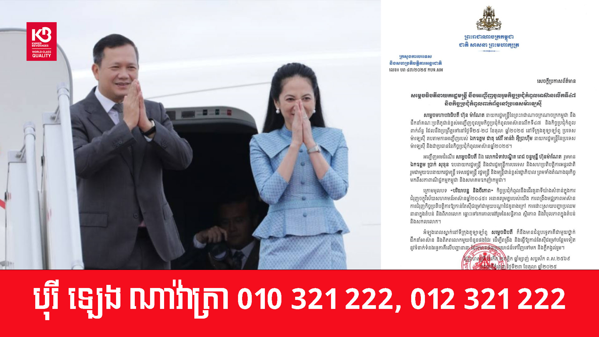 សម្តេចមហាបវរធិបតី ហ៊ុន ម៉ាណែត នាយករដ្ឋមន្ត្រីនៃព្រះរាជាណាចក្រណាចក្រកម្ពុជា នឹងដឹកនាំគណៈប្រតិភូជាន់ខ្ពស់អញ្ជើញចូលរួមកិច្ចប្រជុំកំពូលអាស៊ានលើកទី៤៧ និងកិច្ចប្រជុំកំពូលពាក់ព័ន្ធ ដែលនឹងប្រព្រឹត្តទៅនៅថ្ងៃទី២៥-២៨ ខែតុលា ឆ្នាំ២០២៥ នៅទីក្រុងគូឡាឡាំពួ ប្រទេសម៉ាឡេស៊ី។ នេះបើតាមសេចក្តីប្រកាសព័ត៌មានរបស់ក្រសួងការបរទេស និងសហប្រត្តិការអន្តរជាតិ នាថ្ងៃទី២៣ ខែតុលានេះ។