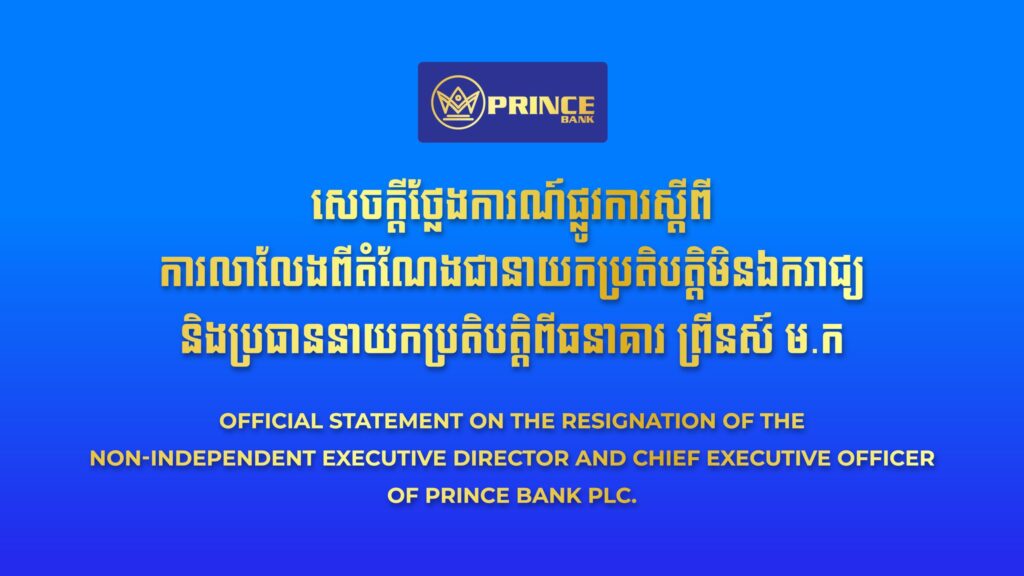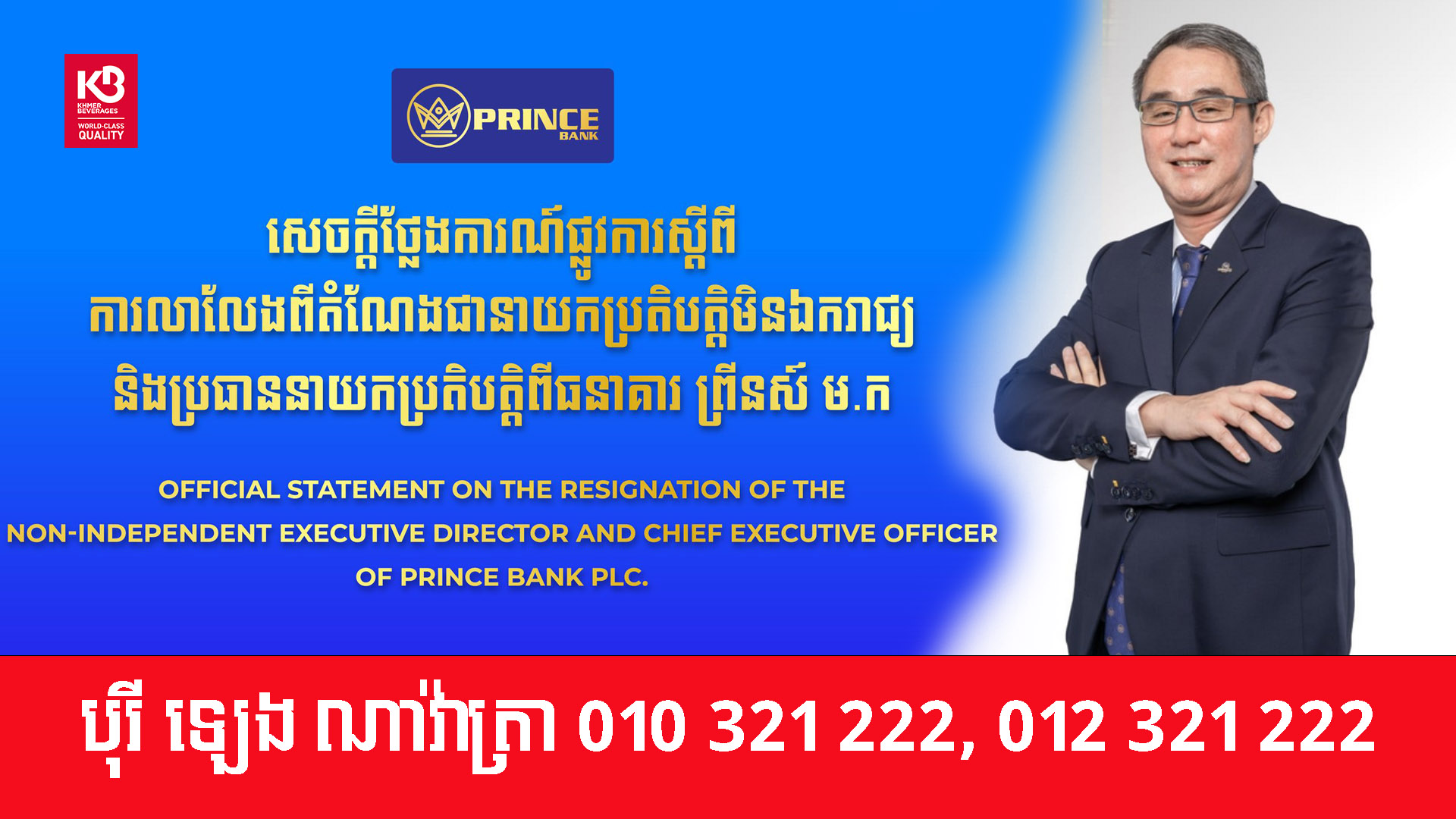 “ភ្នំពេញ – ថ្ងៃទី ២២ ខែតុលា ឆ្នាំ ២០២៥ – ខ្ញុំសូមប្រកាសអំពីការសម្រេចចិត្តរបស់ខ្ញុំ ក្នុងការលាលែងពី​តំណែងនាយកប្រតិបត្តិមិនឯករាជ្យ និងប្រធាននាយកប្រតិបត្តិ នៃធនាគារ ព្រីនស៍ ម.ក ដែលមានប្រសិទ្ធភាព​ភ្លាមៗ ចាប់ពីថ្ងៃទី ២២ ខែតុលា ឆ្នាំ២០២៥ ដើម្បីបន្តការងារផ្ទាល់ខ្លួនរបស់ខ្ញុំ។