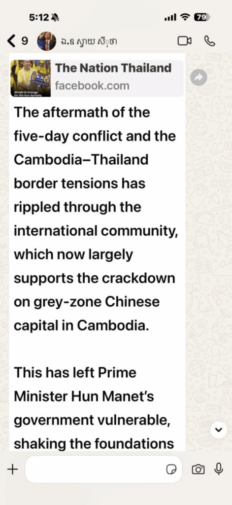 តាមរយៈបណ្ដាញសង្គមនាព្រលប់ថ្ងៃទី២៣ ខែតុលា ឆ្នាំ២០២៥ សម្ដេចតេជោ ហ៊ុន សែន បានលើកឡើងថា៖« ក្រោយពេលអានកាសែតថៃ The Nation ចុះផ្សាយពីកម្ពុជា ខ្ញុំមានការចាំបាច់ធ្វើការណែនាំពួកគេឲ្យមានវិជ្ជាជីវៈក្នុងការសរសេរ។ អ្វីដែលខ្ញុំគួរណែនាំទៅក្រុមកាសែតអស់លោកនោះគឺថា អស់លោកគួរផ្តោតការយកចិត្តទុកដាក់លើសភាពការណ៍ផ្ទៃក្នុងថៃល្អជាង មកគិតពីអនាគតនយោបាយផ្ទៃក្នុងកម្ពុជា»។
