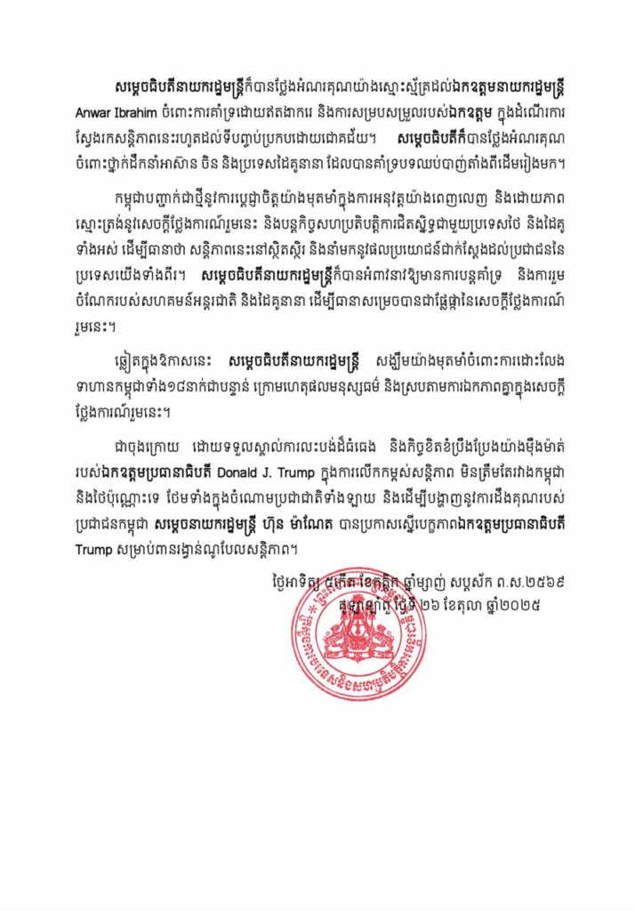តាមរយៈសេចក្ដីប្រកាសព័ត៌មានដដែលនេះ បានឱ្យដឹងថា តាងនាមប្រជាជនកម្ពុជា សម្តេចធិបតីនាយករដ្ឋមន្ត្រី ហ៊ុន ម៉ាណែត បានថ្លែងអំណរគុណ យ៉ាងជ្រាលជ្រៅបំផុតចំពោះឯកឧត្តមប្រធានាធិបតី Donald J. Trump ក្នុងភាពជាអ្នកដឹកនាំដ៏ម៉ឺងម៉ាត់ និងការប្តេជ្ញាចិត្តយ៉ាងខ្ជាប់ខ្ជួនក្នុងការគាំទ្រសន្តិភាពជានិរន្តន៍រវាងកម្ពុជានិងថៃ និងចំពោះកិច្ចខិតខំប្រឹងប្រែងដោយមិនគិតពីការនឿយហត់ក្នុងការជួយធ្វើឱ្យសមិទ្ធផលនេះក្លាយជាការពិត។