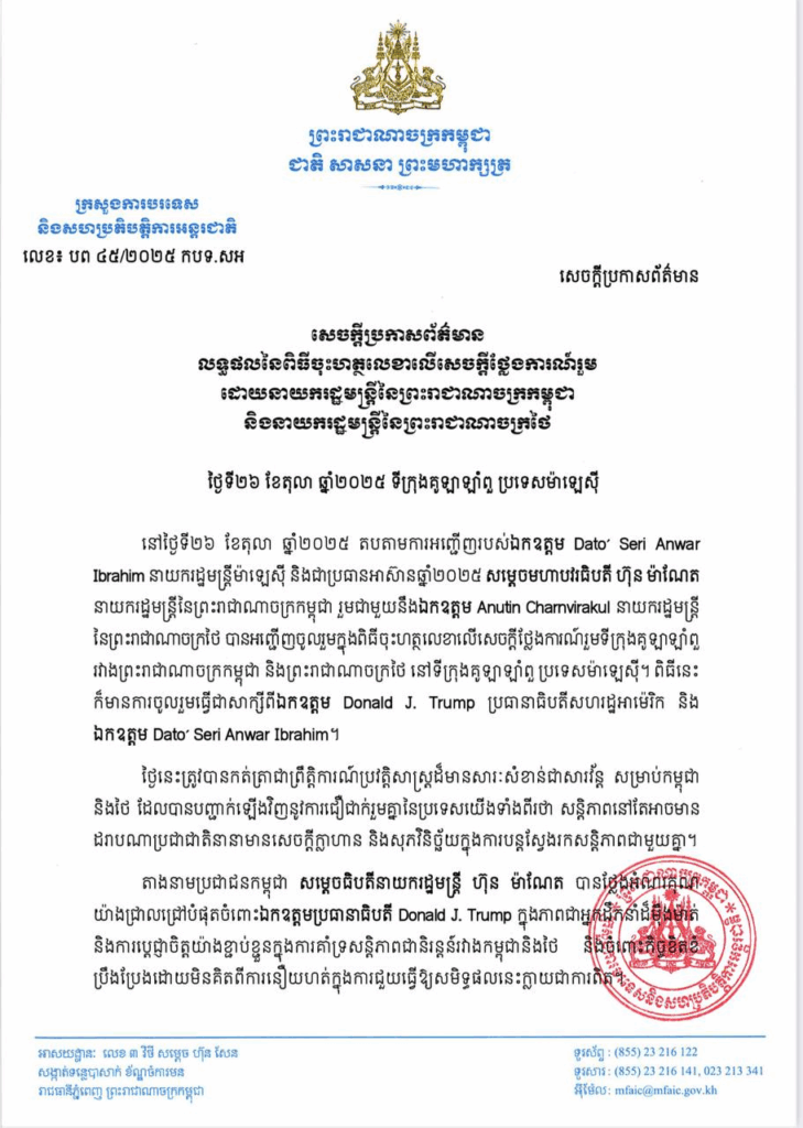 តាមរយៈសេចក្ដីប្រកាសព័ត៌មាននេះ បានឱ្យដឹងថា នៅថ្ងៃទី២៦ ខែតុលា ឆ្នាំ២០២៥ តបតាមការអញ្ជើញរបស់ឯកឧត្តម Dato’ Seri Anwar Ibrahim នាយករដ្ឋមន្ត្រីម៉ាឡេស៊ី និងជាប្រធានអាស៊ានឆ្នាំ២០២៥ សម្តេចមហាបវរធិបតី ហ៊ុន ម៉ាណែត នាយករដ្ឋមន្ត្រីនៃព្រះរាជាណាចក្រកម្ពុជា រួមជាមួយនឹងឯកឧត្តម Anutin Charnvirakul នាយករដ្ឋមន្តី នៃព្រះរាជាណាចក្រថៃ បានអញ្ជើញចូលរួមក្នុងពិធីចុះហត្ថលេខាលើសេចក្ដីថ្លែងការណ៍រួមទីក្រុងគូឡាឡាំពួ រវាងព្រះរាជាណាចក្រកម្ពុជា និងព្រះរាជាណាចក្រថៃ នៅទីក្រុងគូឡាឡាំពួ ប្រទេសម៉ាឡេស៊ី។ ពិធីនេះ ក៏មានការចូលរួមធ្វើជាសាក្សីពីឯកឧត្តម Donald J. Trump ប្រធានាធិបតីសហរដ្ឋអាម៉េរិក និង ឯកឧត្តម Dato Seri Anwar Ibrahim។