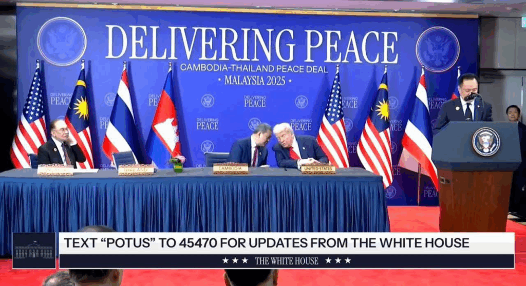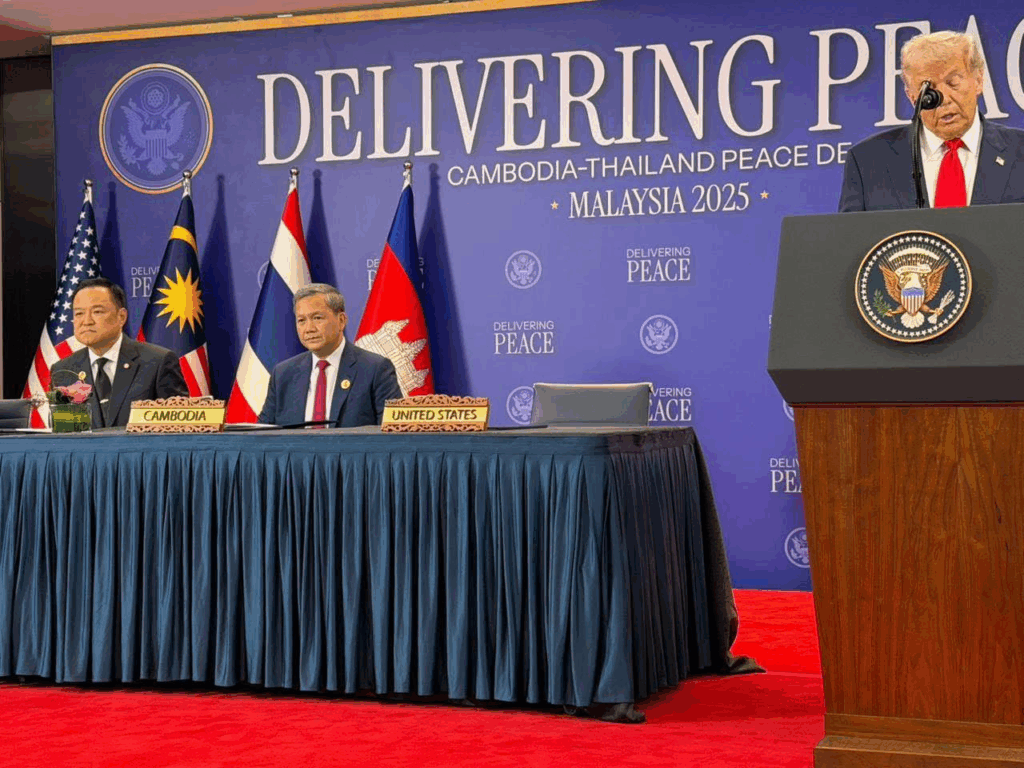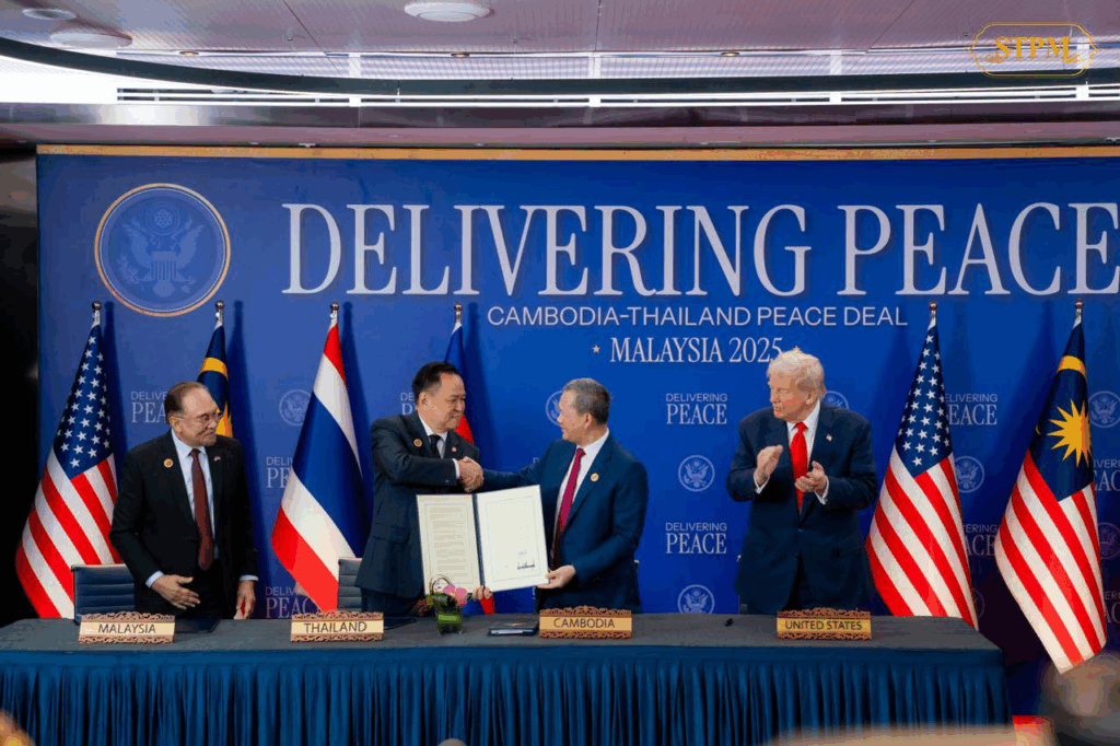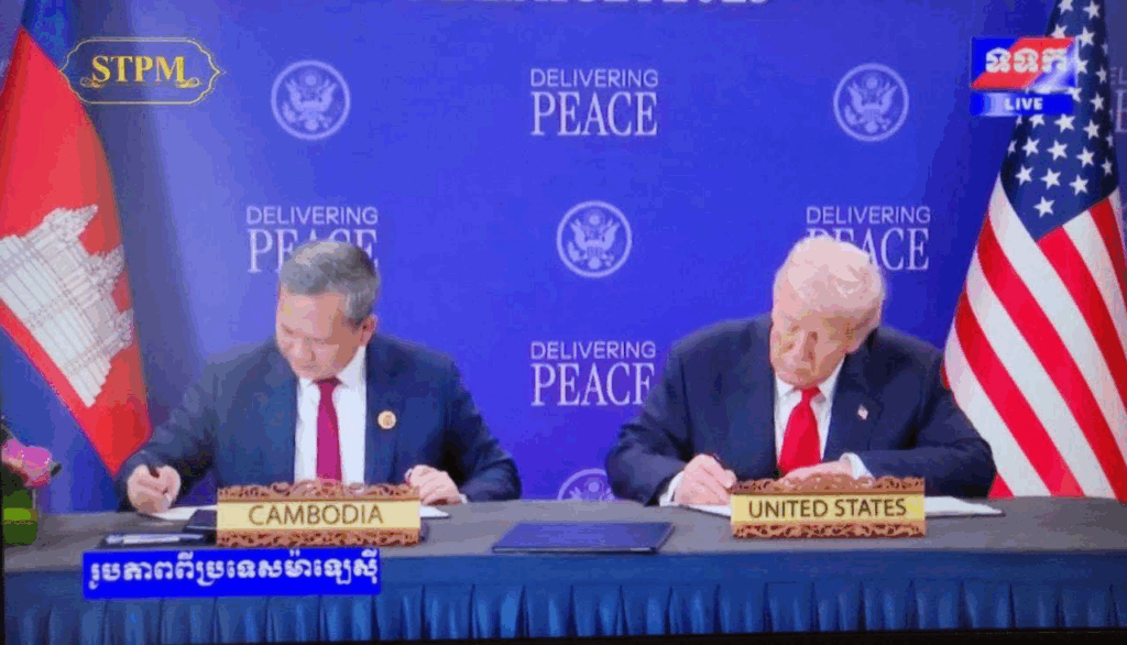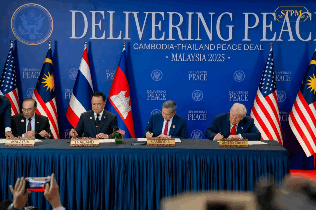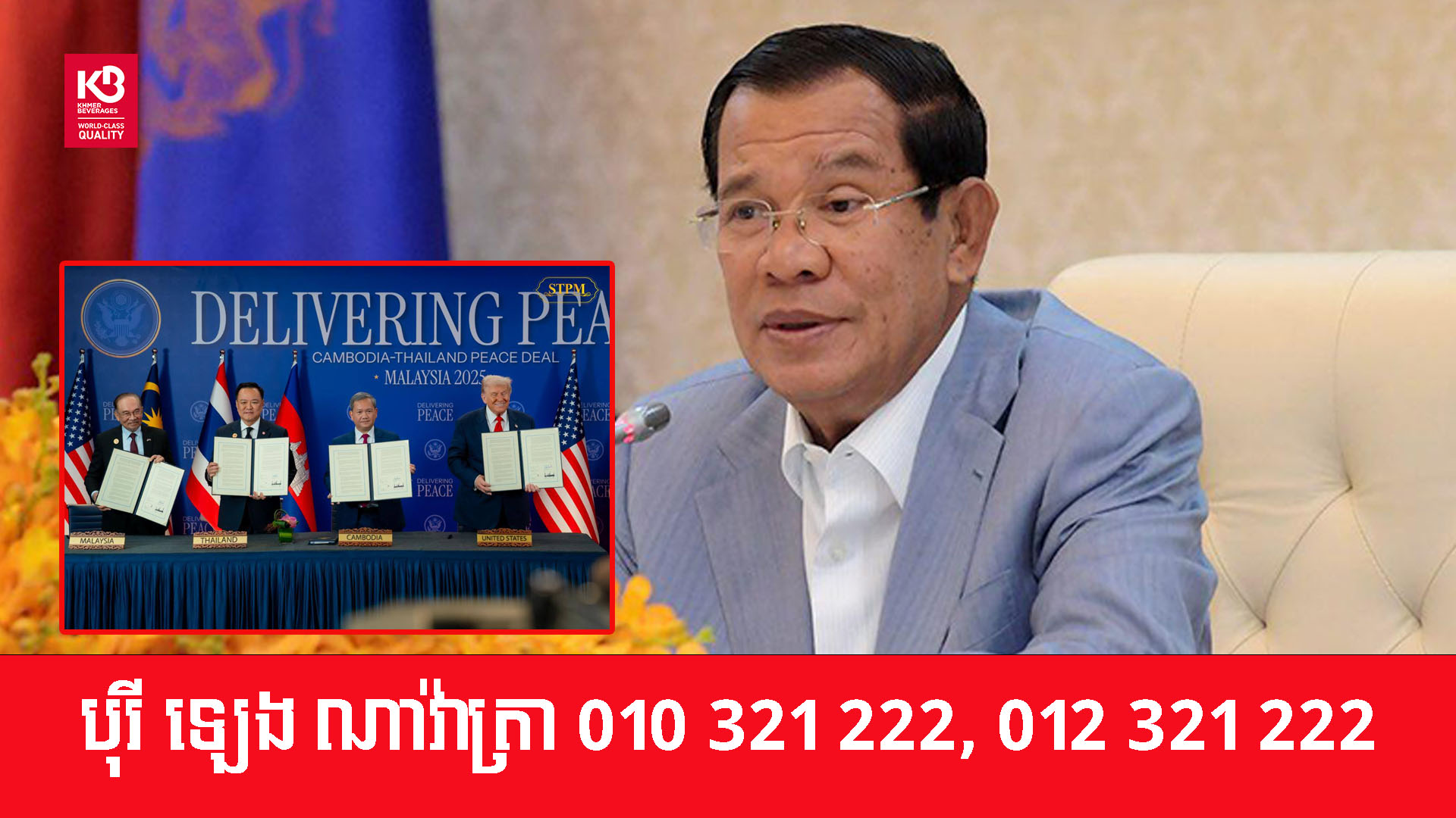 សូមជម្រាបជូនថា កិច្ចព្រមព្រៀងសន្តិភាពកម្ពុជា-ថៃ ត្រូវបានចុះហត្ថលេខានៅទីក្រុងកូឡាឡាំពួ នាព្រឹកថ្ងៃទី២៦ ខែតុលានេះដោយ សម្តេចមហាបវរធិបតី ហ៊ុន ម៉ាណែត នាយករដ្ឋមន្ត្រីកម្ពុជា និងលោក Anutin Charnvirakul នាយករដ្ឋមន្ត្រីថៃ ដោយមានការចូលរួមធ្វើជាសាក្សីពី លោកដូណាល់ ត្រាំ ប្រធានាធិបតីអាមេរិក និងនាយករដ្ឋមន្រ្តីម៉ាឡេស៊ី ជាសាក្សី។