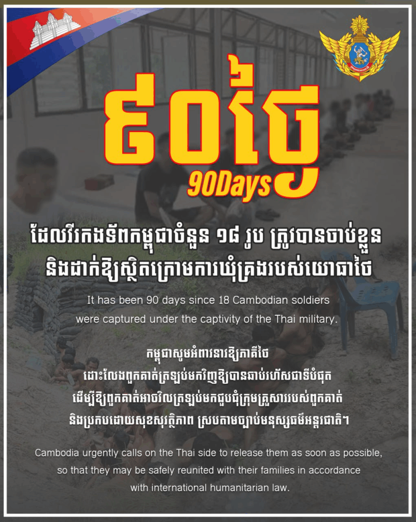 ក្រសួងការពារជាតិ នៅព្រឹកថ្ងៃទី២៧ ខែតុលា ឆ្នាំ២០២៥នេះ បានបន្ដអំពាវនាវឱ្យភាគីថៃ ដោះលែងវីរកងទ័ពកម្ពុជាចំនួន១៨រូប ឱ្យបានឆាប់រហ័សជាទីបំផុត ដើម្បីឱ្យពួកគាត់អាចវិលត្រឡប់មកជួបជុំក្រុមគ្រួសាររបស់ពួកគាត់ និងប្រកបដោយសុខសុវត្ថិភាព ស្របតាមច្បាប់មនុស្សធម៌អន្តរជាតិ។