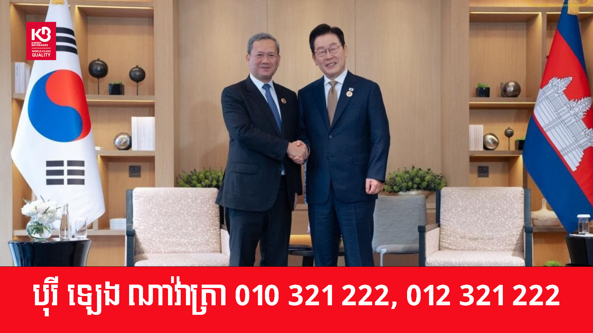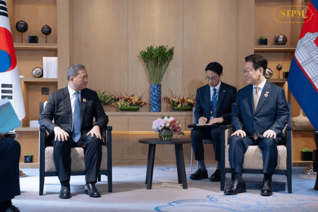 ប្រមុខដឹកនាំកម្ពុជា-កូរ៉េខាងត្បូង បានជួបពិភាក្សាគ្នា ដើម្បីពង្រីកកិច្ចសហប្រតិបត្តិការឱ្យកាន់តែរីកចម្រើន ខណៈមេដឹកនាំទាំងពីរ ក៏បានឯកភាពថា នឹងរួមគ្នាផ្សព្វផ្សាយនូវព័ត៌មានលទ្ធផលវិជ្ជមាននៃកិច្ចសហប្រតិបត្តិការនានារវាងប្រទេសទាំងពីរឱ្យកាន់តែទូលាយថែមទៀតផងដែរ។ នេះបើយោងតាមជំនួបពិភាក្សាគ្នា រវាងសម្តេចធិបតី ហ៊ុន ម៉ាណែត នាយករដ្ឋមន្រ្តីនៃកម្ពុជា ជាមួយលោក Lee Jae Myung ប្រធានាធិបតីនៃសាធារណរដ្ឋកូរ៉េ កាលថ្ងៃទី២៧ ខែតុលា ឆ្នាំ២០២៥។