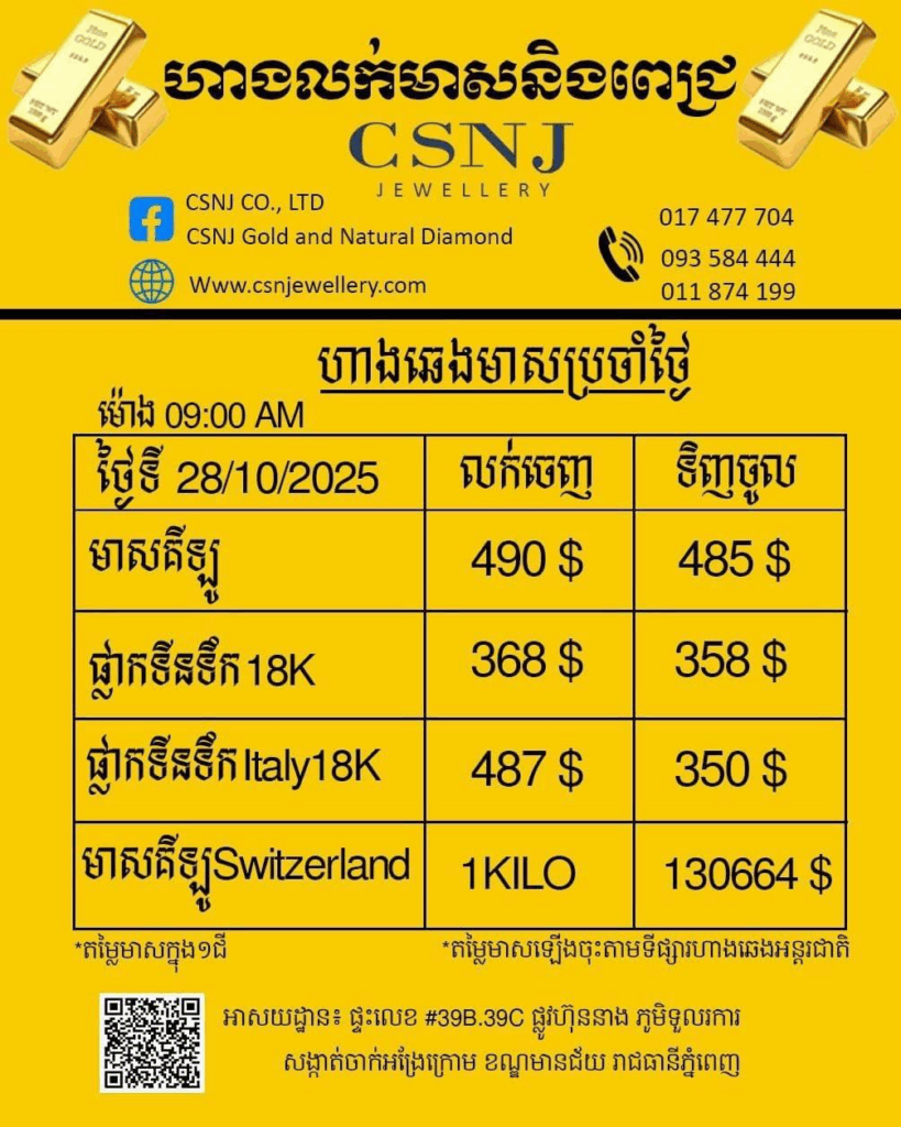 តម្លៃមាសនៅថ្ងៃទី២៨ ខែតុលា ឆ្នាំ២០២៥នេះ បានបន្ដធ្លាក់ថ្លៃទៀតហើយ បើធៀបនឹងថ្ងៃម្សិលមិញ ពោលគឺមានតម្លៃ ៤៩០ដុល្លារ នៅក្នុងមួយជី ជាតម្លៃលក់ចេញ និងទិញចូលក្នុងតម្លៃ ៤៨៥ដុល្លារ។ នេះបើយោងតាមហាងឆេងមាស ពីហាងមាសពេជ្រ CSNJ របស់លោកឧកញ៉ា ចិន សំណាង នាព្រឹក ម៉ោង៩:០០ នាទី ថ្ងៃទី២៨ ខែតុលា។