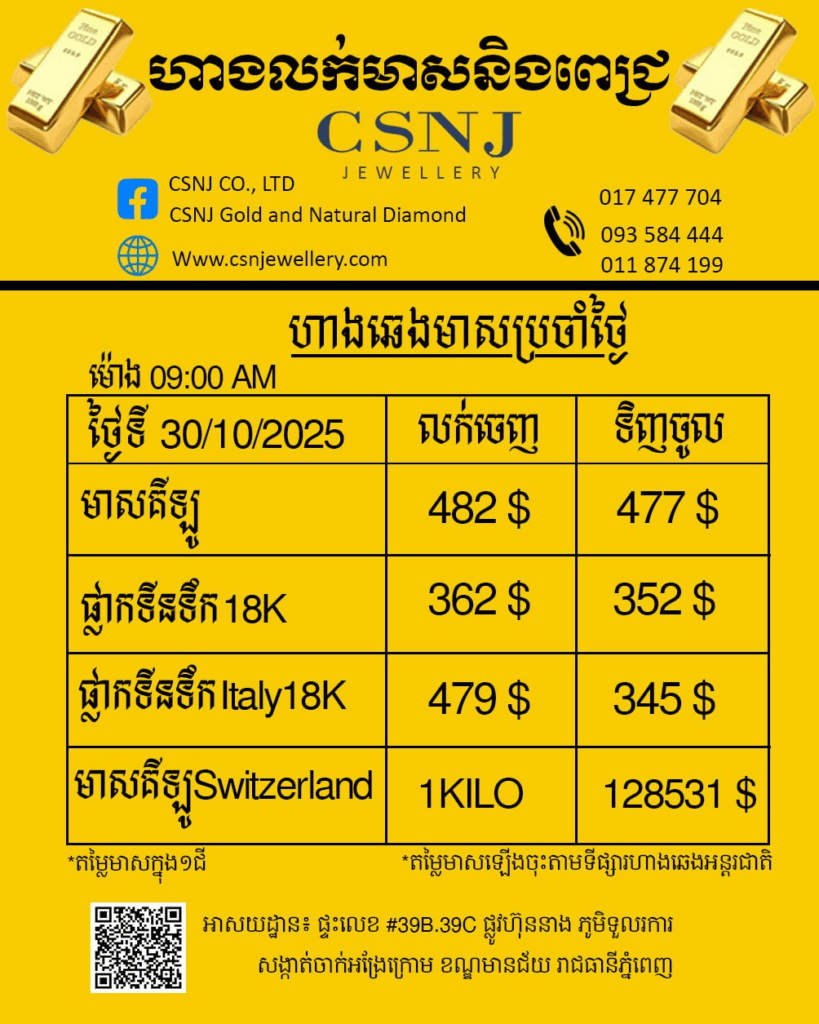 តម្លៃមាសនៅថ្ងៃទី៣០ ខែតុលា ឆ្នាំ២០២៥នេះ នៅរក្សាតម្លៃថេរដដែល បើធៀបនឹងរសៀលថ្ងៃម្សិលមិញ ពោលគឺមានតម្លៃ ៤៨២ដុល្លារ នៅក្នុងមួយជី ជាតម្លៃលក់ចេញ និងទិញចូលក្នុងតម្លៃ ៤៧៧ដុល្លារ។ នេះបើយោងតាមហាងឆេងមាស ពីហាងមាសពេជ្រ CSNJ របស់លោកឧកញ៉ា ចិន សំណាង នាព្រឹក ម៉ោង៩:០០ នាទី ថ្ងៃទី៣០ ខែតុលា។