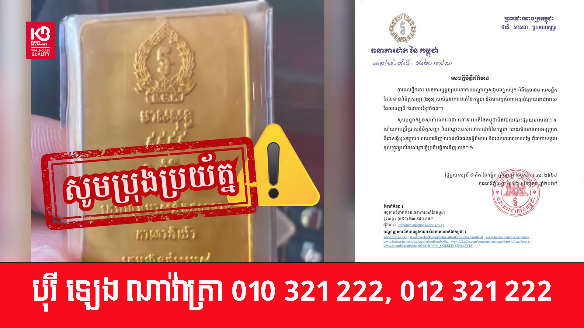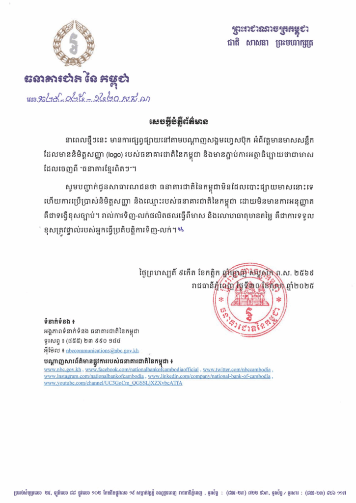 ធនាគារជាតិនៃកម្ពុជា នៅរសៀលថ្ងៃទី៣០ ខែតុលា ឆ្នាំ២០២៥នេះ បានចេញបំភ្លឺដោយបញ្ជាក់ថា ធនាគារជាតិនៃកម្ពុជា មិនមានការបោះផ្សាយ«មាសសន្លឹក» ដាក់និមិត្តសញ្ញារបស់ធនាគារជាតិនោះទេ និងអំពាវនាវឱ្យពលរដ្ឋមានការប្រុងប្រយ័ត្ន។