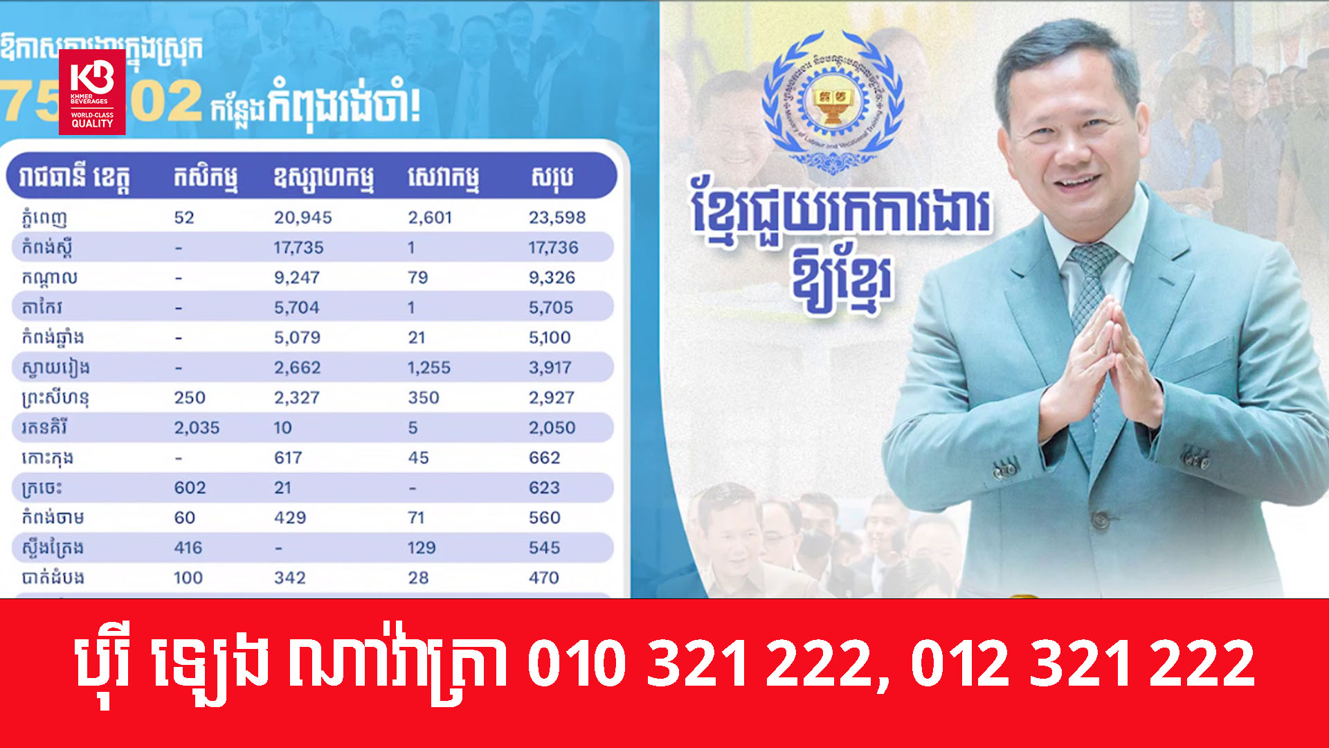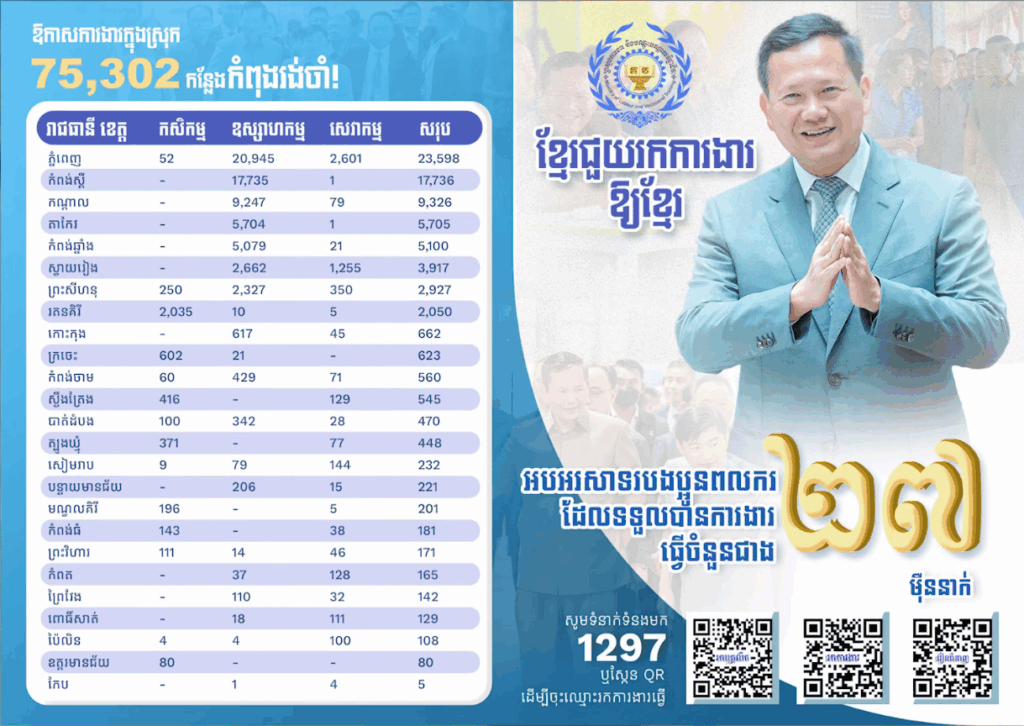 ក្រសួងការងារ និងបណ្ដុះបណ្ដាលវិជ្ជាជីវៈ បានឱ្យដឹងថា នៅដើមខែវិច្ឆិកា ឆ្នាំ២០២៥ ឱកាសការងារនៅក្នុងភូមិសាស្រ្ដរាជធានី ខេត្ដទូទាំងប្រទេសកម្ពុជា ចំនួន ៧៥,៣០២ កន្លែង កំពុងរងចាំបងប្អូនប្រជាពលរដ្ឋ ជាពិសេសបងប្អូនដែលត្រឡប់ពីប្រទេសថៃ មកដាក់ពាក្យធ្វើការ។