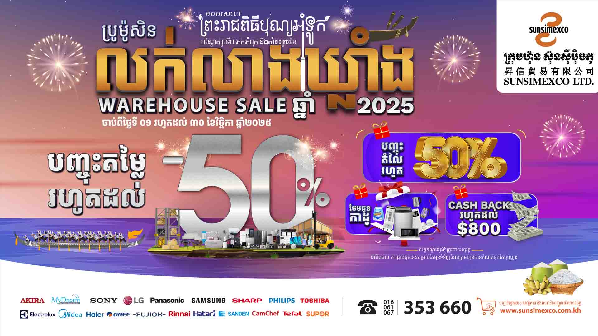 ដើម្បីអបអរសាទរព្រះរាជពិធីបុណ្យអុំទូក បណ្ដែតប្រទីប អកអំបុក និងសំពះព្រះខែនេះ ក្រុមហ៊ុនស៊ុនស៊ីម៉ិចកូ យើងខ្ញុំក៏បានរៀបចំនូវកម្មវិធីប្រូម៉ូសិនលក់បញ្ចុះតម្លៃពិសេសរហូតដល់ ៥០% ទៅលើទូរស័ព្ទដៃ ​គ្រឿងសង្ហារឹម និងផលិតផលអេឡិចត្រូនិច សម្រាប់ប្រើប្រាស់ក្នុងផ្ទះជាច្រើនមុខ រួមទាំងថែមជូនកាដូជាច្រើនទៀតមុខដូចជា៖