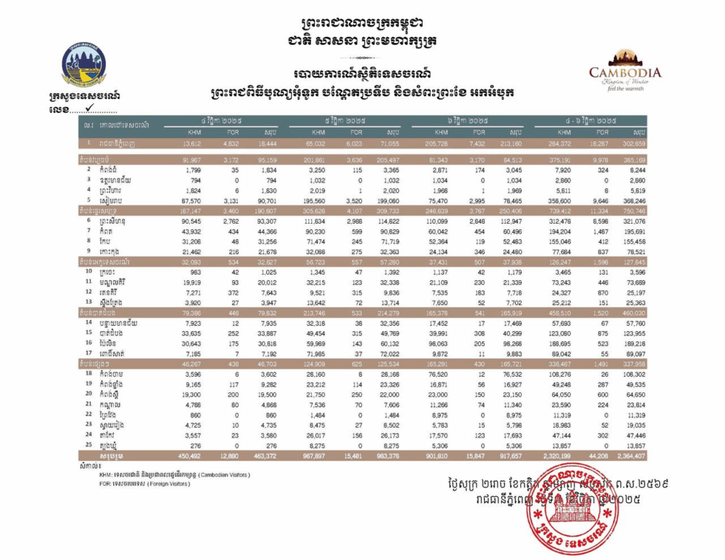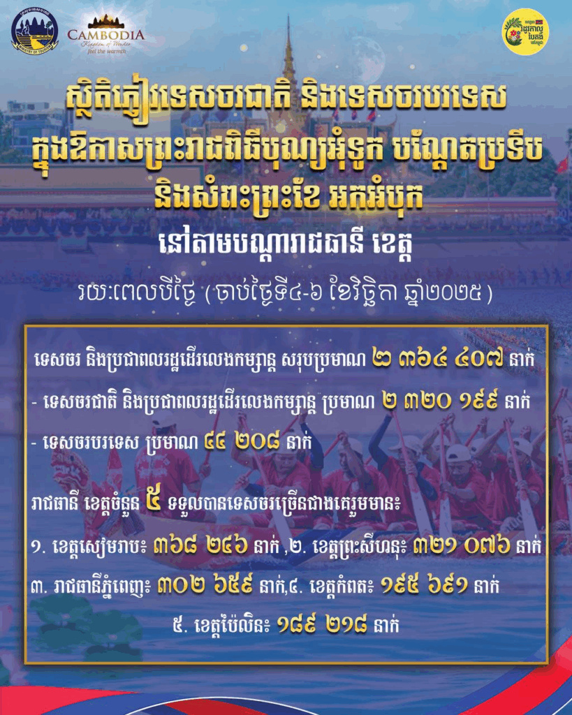 របាយការណ៍ក្រសួងទេសចរណ៍ បានឱ្យដឹងថា ស្ថិតិភ្ញៀវទេសចរជាតិ និងទេសចរបរទេស ក្នុងឱកាសព្រះរាជពិធីបុណ្យអុំទូក បណ្តែតប្រទីប និងសំពះព្រះខែ អកអំបុក នៅតាមបណ្តារាជធានី ខេត្ត រយៈពេលបីថ្ងៃ (ចាប់ថ្ងៃទី៤-៦ ខែវិច្ឆិកា ឆ្នាំ២០២៥) ទេសចរ និងប្រជាពលរដ្ឋដើរលេងកម្សាន្ត សរុបប្រមាណ ២ ៣៦៤ ៤០៧ នាក់ ។