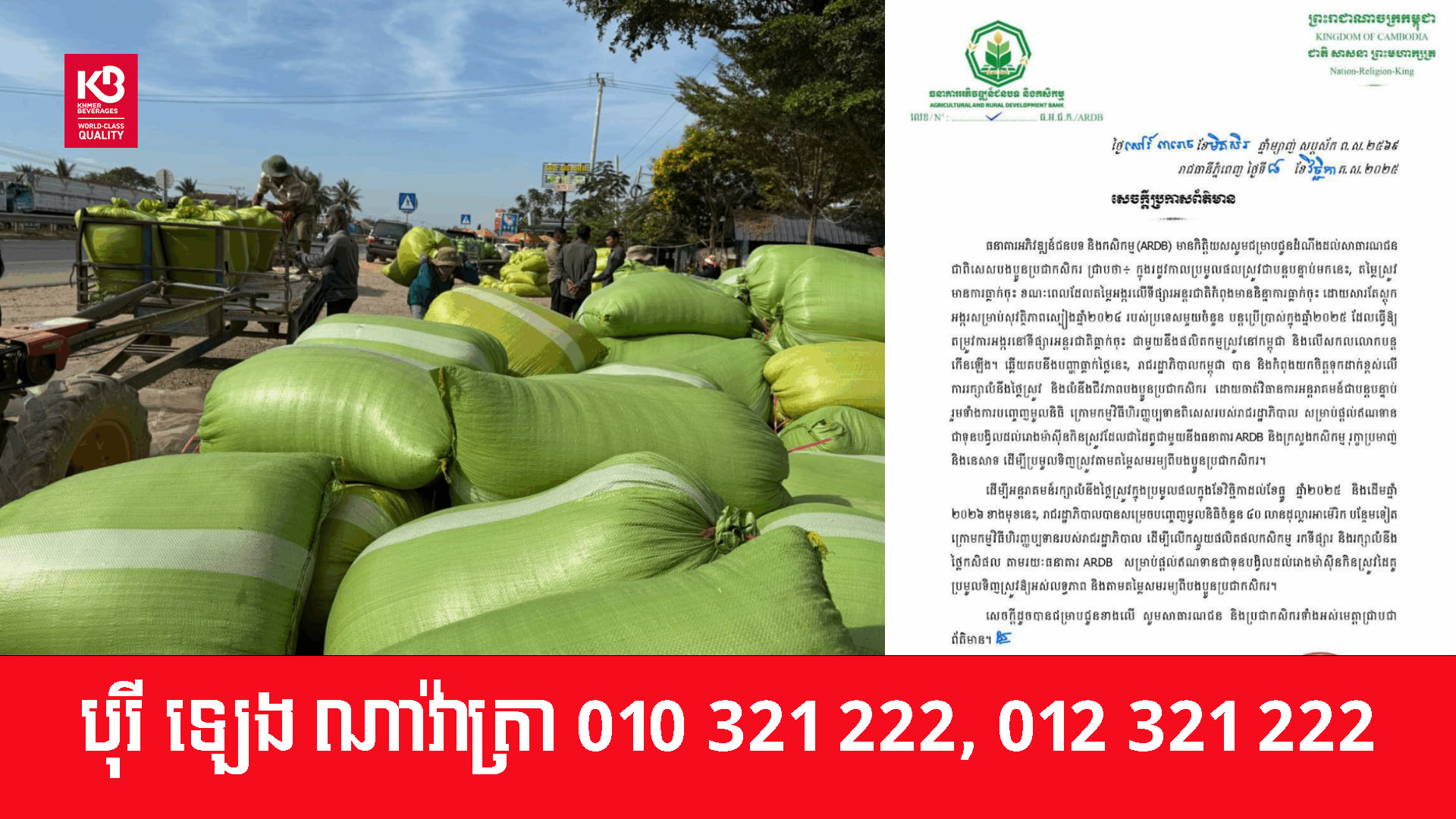 ដើម្បីអន្តរាគមន៍រក្សាលំនឹងថ្លៃស្រូវក្នុងប្រមូលផលក្នុងខែវិច្ឆិកាដល់ខែធ្នូ ឆ្នាំ២០២៥ និងដើមឆ្នាំ ២០២៦ ខាងមុខនេះ, រាជរដ្ឋាភិបាលបានសម្រេចបញ្ចេញមូលនិធិចំនួន ៤០ លានដុល្លារអាម៉េរិក បន្ថែមទៀត ក្រោមកម្មវិធីហិរញ្ញប្បទានរបស់រាជរដ្ឋាភិបាល ដើម្បីលើកស្ទួយផលិតផលកសិកម្ម រកទីផ្សារ និងរក្សាលំនឹង ថ្លៃកសិផល តាមរយៈធនាគារ ARDB សម្រាប់ផ្តល់ឥណទានជានបង្វិលដល់រោងម៉ាស៊ីនកិនស្រូវដៃគូ ប្រមូលទិញស្រូវឱ្យអស់លទ្ធភាព និងតាមតម្លៃសមរម្យពីបងប្អូនប្រជាកសិករ។