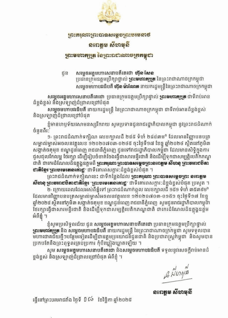 យោងតាមលិខិតចុះថ្ងៃទី៨ ខែវិច្ឆិកា ឆ្នាំ២០២៥ បានឱ្យដឹងថា ព្រះមហាក្សត្រ នៃព្រះរាជាណាចក្រកម្ពុជា ទ្រង់សព្វព្រះរាជហឫទ័យសោមនស្សរីករាយ ព្រះរាជទានជូនរាជរដ្ឋាភិបាលកម្ពុជា នូវព្រះរាជដំណាក់ចំនួនពីរគឺ៖