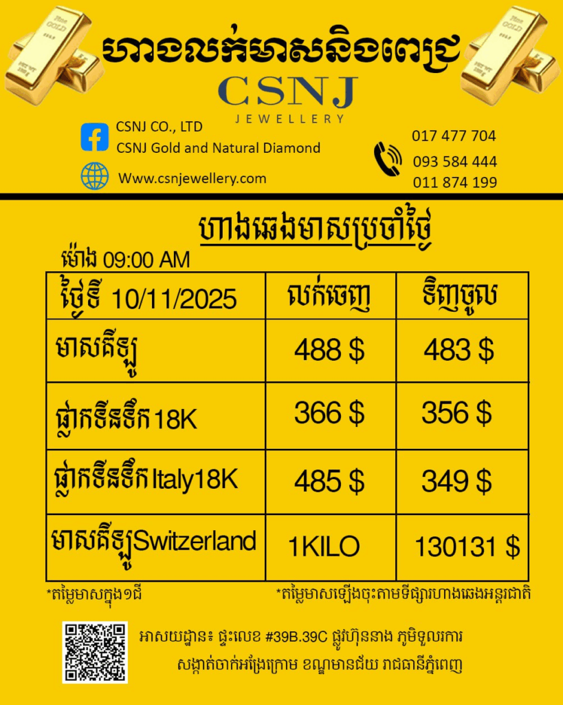 តម្លៃមាសនៅថ្ងៃទី១០ ខែវិច្ឆិកា ឆ្នាំ២០២៥នេះ បានឡើងថ្លៃវិញហើយ បើធៀបនឹងចុងសប្ដាហ៍មុន ពោលគឺមានតម្លៃ ៤៨៨ដុល្លារ នៅក្នុងមួយជី ជាតម្លៃលក់ចេញ និងទិញចូលក្នុងតម្លៃ ៤៨៣ដុល្លារ។ នេះបើយោងតាមហាងឆេងមាស ពីហាងមាសពេជ្រ CSNJ របស់លោកឧកញ៉ា ចិន សំណាង នាព្រឹក ម៉ោង៩:០០ នាទី ថ្ងៃទី១០ ខែវិច្ឆិកា។