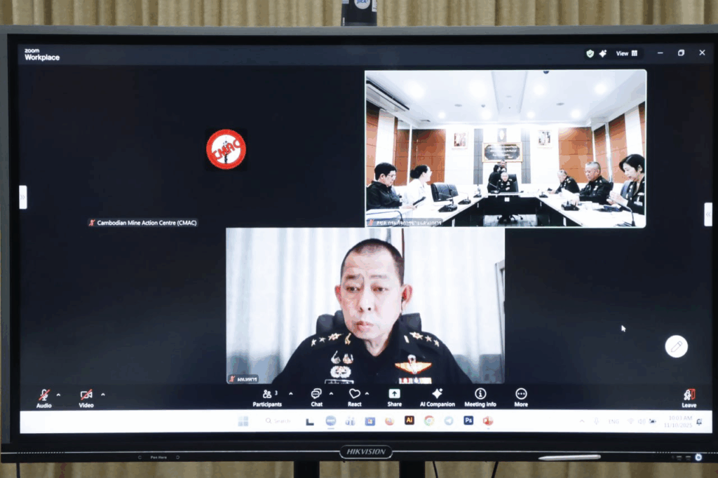 លោកជំទាវ ឧត្តមសេនីយ៍ឯក ម៉ាលី សុជាតា អ្នកនាំពាក្យក្រសួងការពារជាតិ បានឱ្យដឹងថា នៅថ្ងៃទី១០ ខែវិច្ឆិកា ឆ្នាំ២០២៥នេះ ក្រុមការងារនៃមជ្ឈមណ្ឌលសកម្មភាពកំចាត់មីនកម្ពុជា (CMAC) និងក្រុមការងារនៃមជ្ឈមណ្ឌលសកម្មភាពកំចាត់មីនថៃ (TMAC) បានបើកកិច្ចប្រជុំតាមប្រព័ន្ធ VTC ដើម្បីបន្តពិភាក្សាលម្អិតអំពីតំបន់សាកល្បងក្នុងតំបន់អាទិភាពនៅព្រំដែន។