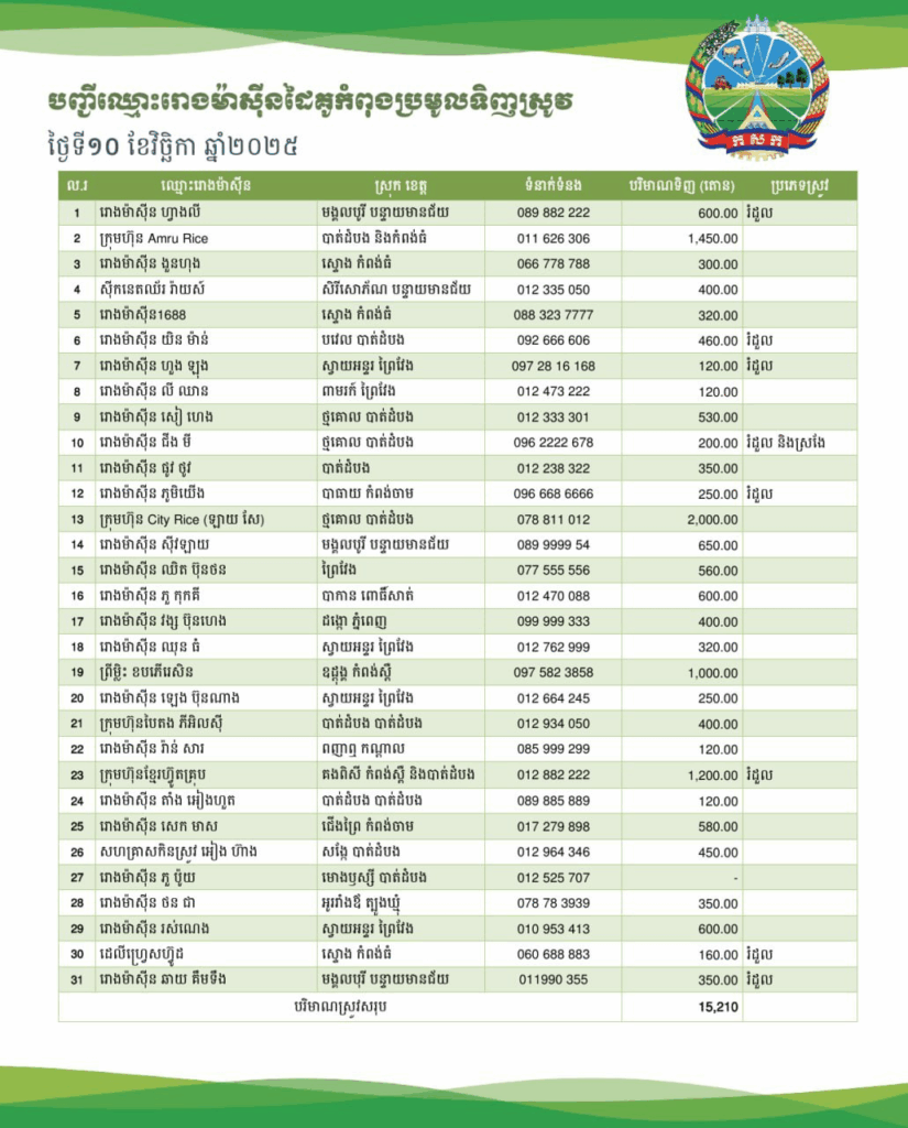 សូមបញ្ជាក់ថា ដើម្បីដោះស្រាយបញ្ហាកកស្ទះស្រូវនៅតាមទីវាល រោងម៉ាស៊ីនជាដៃគូរបស់ក្រសួងកសិកម្ម បានប្រមូលទិញស្រូវជាបន្តបន្ទាប់ ដោយក្នុងនោះមានប្រភេទស្រូវចំនួន៤ គឺ ស្រូវផ្ការំដួល ស្រូវវស្សា ស្រូវកែង និងស្រូវស្រងែ។