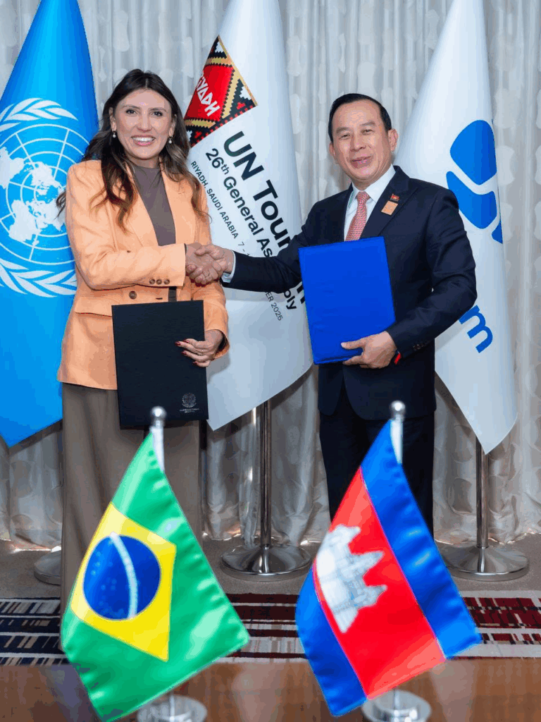 ដោយទទួលបានសិទ្ធិប្រទានក្នុងការចុះអនុស្សរណៈនៃការយោគយល់គ្នាដ៏ខ្ពង់ខ្ពស់ពីរាជរដ្ឋាភិបាលកម្ពុជា និងក្នុងឱកាសដឹកនាំគណៈប្រតិភូជាន់ខ្ពស់ក្រសួងទេសចរណ៍ ចូលរួមមហាសន្និបាតអង្គការទេសចរណ៍សហប្រជាជាតិលើកទី២៦ (UN Tourism – 26th General Assembly) នៅរាជធានីរីយ៉ាដ លោក ហួត ហាក់ រដ្ឋមន្រ្តីក្រសួងទេសចរណ៍ និងលោកស្រី ANA CARLA MACHADO LOPES អនុរដ្ឋមន្ត្រីទេសចរណ៍ ប្រស៊ីល និងជាលេខាធិការប្រតិបត្តិអង្គការទេសចរណ៍សហប្រជាជាតិ បានចុះហត្ថលេខាលើអនុស្សរណៈនៃការយោគយល់គ្នាស្តីពីសហប្រតិបត្តិការទេសចរណ៍រវាងព្រះរាជាណាចក្រកម្ពុជា និងសាធារណរដ្ឋសហព័ន្ធប្រេស៊ីល។