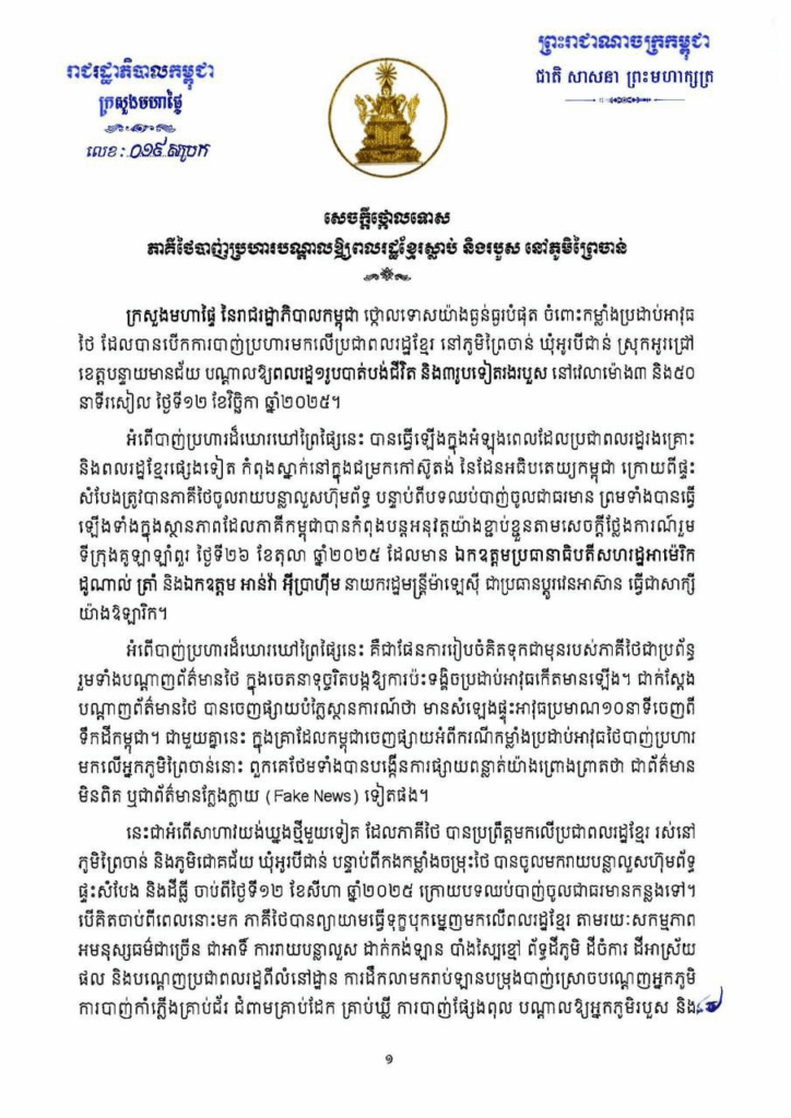 ក្រសួងមហាផ្ទៃ បានលើកឡើងថា អំពើបាញ់ប្រហារដ៏ឃោរឃៅព្រៃផ្សៃនេះ បានធ្វើឡើងក្នុងអំឡុងពេលដែលប្រជាពលរដ្ឋរងគ្រោះ និងពលរដ្ឋខ្មែរផ្សេងទៀត កំពុងស្នាក់នៅក្នុងជម្រកកៅស៊ូតង់ នៃដែនអធិបតេយ្យកម្ពុជា ក្រោយពីផ្ទះ សំបែងត្រូវបានភាគីថៃចូលរាយបន្លាលួសហ៊ុមព័ទ្ធ បន្ទាប់ពីបទឈប់បាញ់ចូលជាធរមាន ព្រមទាំងបានធ្វើឡើងទាំងក្នុងស្ថានភាពដែលភាគីកម្ពុជាបានកំពុងបន្តអនុវត្តយ៉ាងខ្ជាប់ខ្ជួនតាមសេចក្ដីថ្លែងការណ៍រួម ទីក្រុងគូឡាឡាំពួរ ថ្ងៃទី២៦ ខែតុលា ឆ្នាំ២០២៥ ដែលមាន ឯកឧត្តមប្រធានាធិបតីសហរដ្ឋអាម៉េរិក ដូណាល់ ត្រាំ និងឯកឧត្ដម អាន់វ៉ា ស៊ីប្រាហ៊ីម នាយករដ្ឋមន្ដ្រីម៉ាឡេស៊ី ជាប្រធានប្តូរវេនអាស៊ាន ធ្វើជាសាក្សីយ៉ាងឱឡារិក។