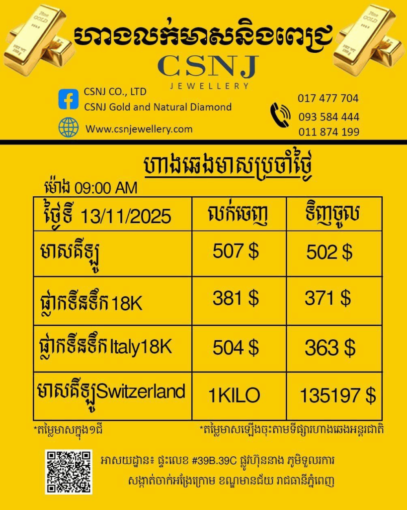 តម្លៃមាសនៅថ្ងៃទី១៣ ខែវិច្ឆិកា ឆ្នាំ២០២៥នេះ បានបន្ដហក់ឡើងខ្ពស់ទៀតហើយ បើធៀបនឹងថ្ងៃម្សិលមិញ ពោលគឺមានតម្លៃ ៥០៧ដុល្លារ នៅក្នុងមួយជី ជាតម្លៃលក់ចេញ និងទិញចូលក្នុងតម្លៃ ៥០២ដុល្លារ។ នេះបើយោងតាមហាងឆេងមាស ពីហាងមាសពេជ្រ CSNJ របស់លោកឧកញ៉ា ចិន សំណាង នាព្រឹក ម៉ោង៩:០០ នាទី ថ្ងៃទី១៣ ខែវិច្ឆិកា។