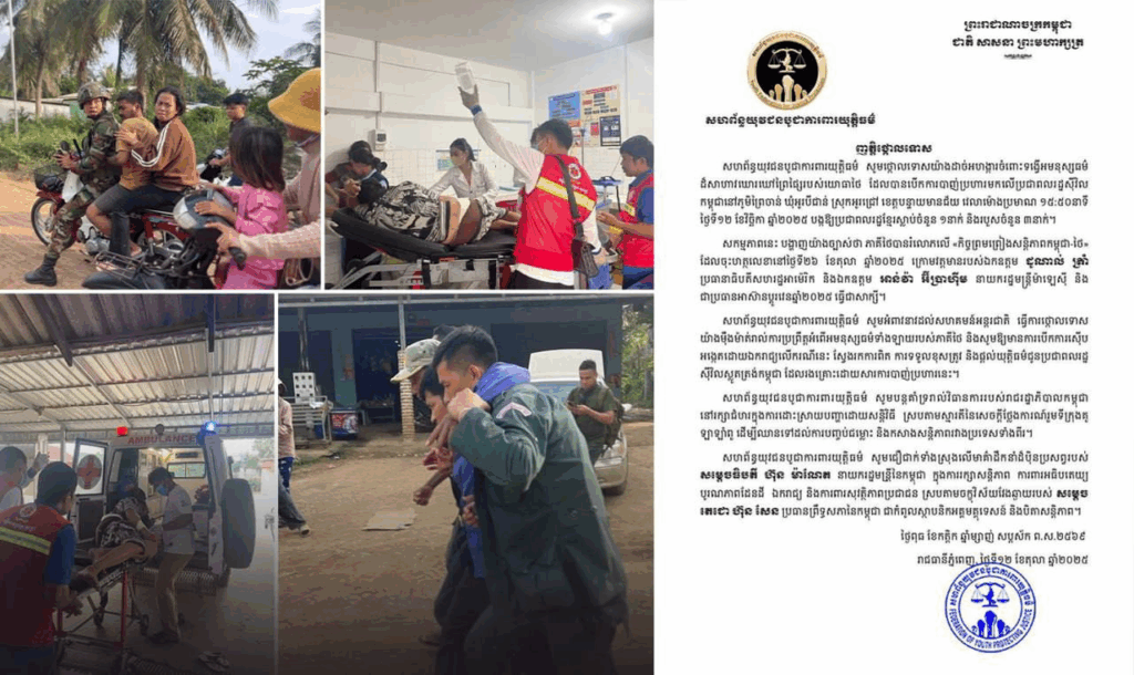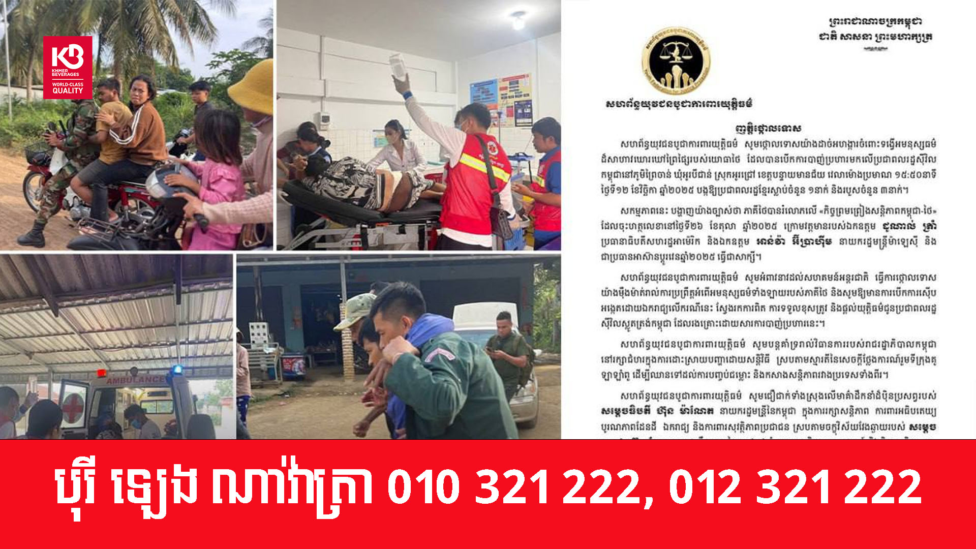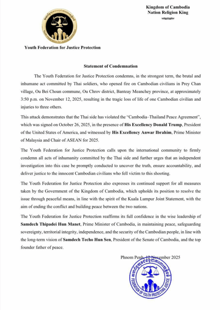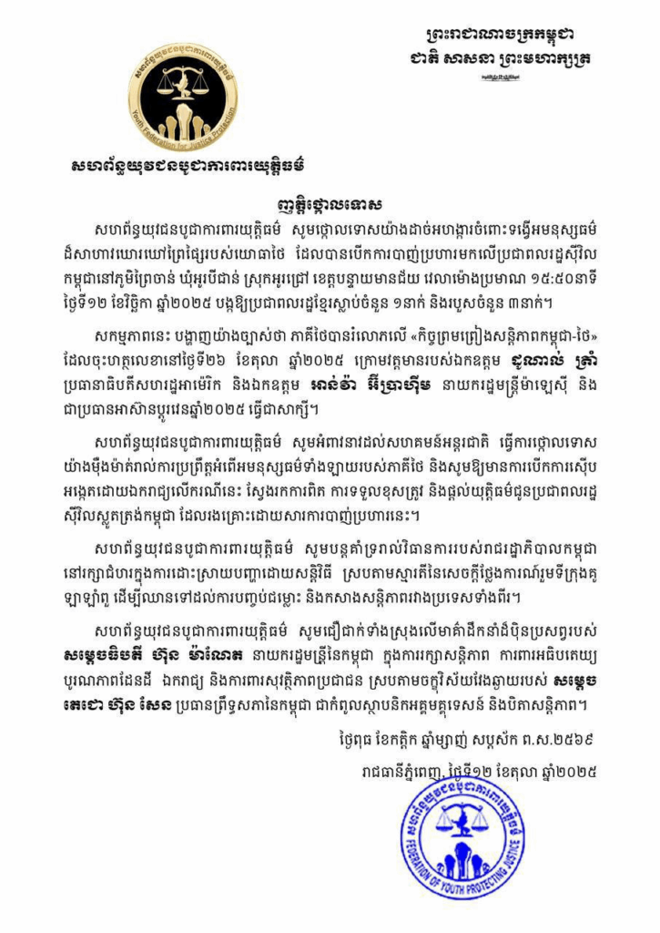 សហព័ន្ធយុវជនបូជាការពារយុត្តិធម៌ សូមថ្កោលទោសយ៉ាងដាច់អហង្ការចំពោះទង្វើអមនុស្សធម៌ដ៏សាហាវឃោរឃៅព្រៃផ្សៃរបស់យោធាថៃ ដែលបានបើកការបាញ់ប្រហារមកលើប្រជាពលរដ្ឋស៊ីវិលកម្ពុជានៅភូមិព្រៃចាន់ ឃុំអូរបីជាន់ ស្រុកអូរជ្រៅ ខេត្តបន្ទាយមានជ័យ វេលាម៉ោងប្រមាណ ១៥:៥០នាទី ថ្ងៃទី១២ ខែវិច្ឆិកា ឆ្នាំ២០២៥ បង្កឱ្យប្រជាពលរដ្ឋខ្មែរស្លាប់ចំនួន ១នាក់ និងរបួសចំនួន ៣នាក់។