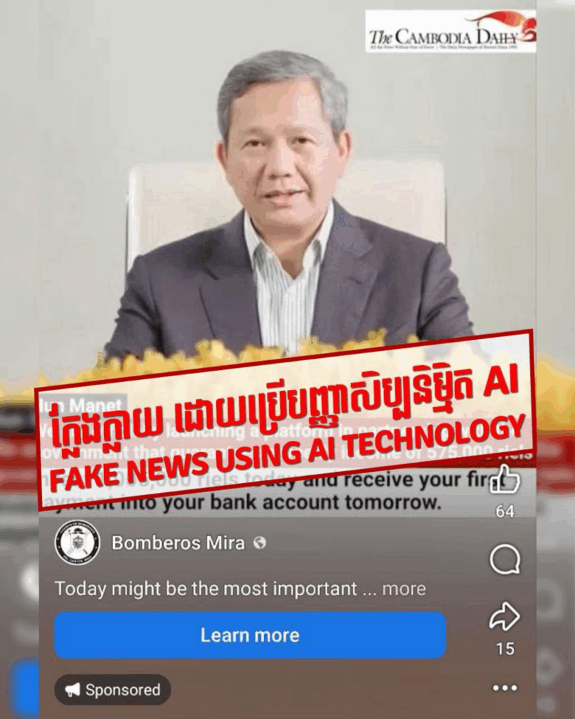 សម្តេចធិបតី ហ៊ុន ម៉ាណែត នាយករដ្ឋមន្រ្តីនៃកម្ពុជា បានប្រាប់ឱ្យប្រជាពលរដ្ឋ និងសាធារណជនទាំងអស់ ប្រុងប្រយ័ត្ន ខណៈមានករណីហ្វេសប៊ុកបានបង្កើតវីដេអូបច្ចេកវិទ្យា AI ក្លែងបន្លំសម្លេងរបស់សម្តេចធិបតីនាយករដ្ឋមន្ត្រី ដើម្បីបញ្ចេញសារផ្ទុយពីការពិត។