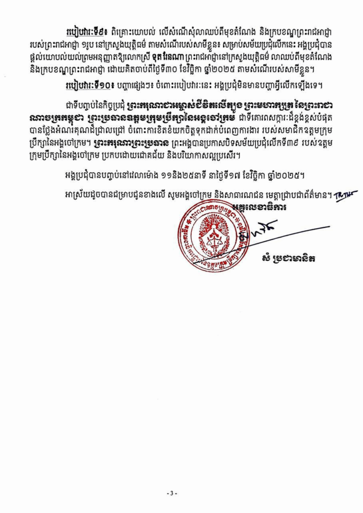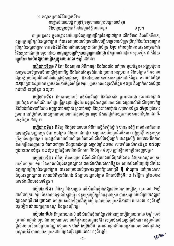 របៀបវារៈទី២៖ ពិនិត្យ និងសម្រេច លើសេចក្តីសម្រេចរបស់ក្រុមប្រឹក្សាវិន័យនៃឧត្តមក្រុមប្រឹក្សា នៃអង្គចៅក្រម ពាក់ព័ន្ធករណីព្រះរាជអាជ្ញា។ អង្គប្រជុំនៃឧត្តមក្រុមប្រឹក្សានៃអង្គចៅក្រម ក៏បានសម្រេចយល់ព្រម លើសេចក្តីសម្រេចរបស់ក្រុមប្រឹក្សាវិន័យនៃឧត្តមក្រុមប្រឹក្សានៃអង្គចៅក្រម ដែលពាក់ព័ន្ធនឹងព្រះរាជអាជ្ញារង ចំនួន ៣រូប ដោយបានសម្រេចដាក់វិន័យ៖