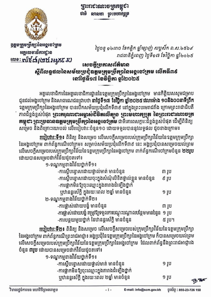 អគ្គលេខាធិការនៃអគ្គលេខាធិការដ្ឋាននៃឧត្តមក្រុមប្រឹក្សានៃអង្គចៅក្រម នាថ្ងៃទី១៧ ខែវិច្ឆិកានេះ បានបង្ហាញលទ្ធផលនៃសម័យប្រជុំឧត្តមក្រុមប្រឹក្សានៃអង្គចៅក្រម លើកទី៣៩ នៅក្នុងព្រះបរមរាជវាំង ក្រោមព្រះរាជាធិបតី ភាពដ៏ខ្ពង់ខ្ពស់បំផុត ព្រះករុណាជាអម្ចាស់ជីវិតលើត្បូង ព្រះមហាក្សត្រ នៃព្រះរាជាណាចក្រ កម្ពុជា ព្រះប្រធានឧត្តមក្រុមប្រឹក្សានៃអង្គចៅក្រម ជាទីគោរពសក្ការៈដ៏ខ្ពង់ខ្ពស់បំផុត ដើម្បីពិនិត្យ សម្រេច និងពិគ្រោះយោបល់ លើរបៀបវារៈចំនួន១០។