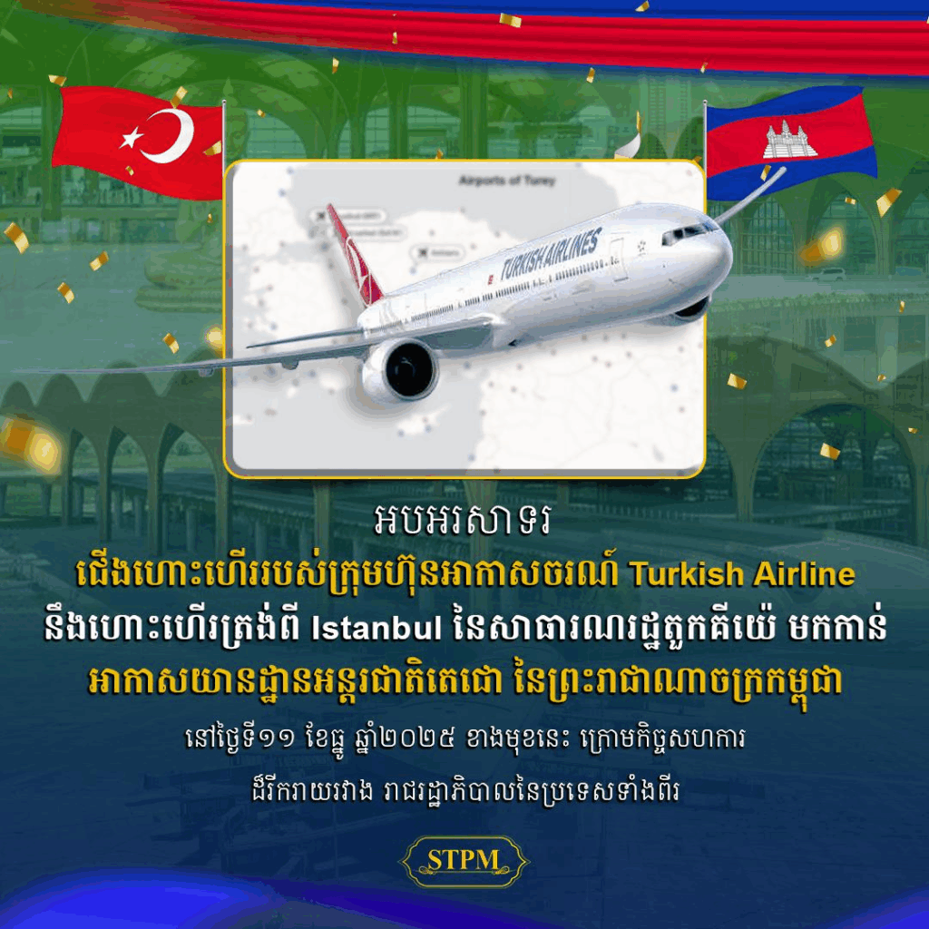 ជើងហោះហើររបស់ ក្រុមហ៊ុនអាកាសចរណ៍ Turkish Airline នឹងហោះហើរត្រង់ពី Istanbul នៃសាធារណរដ្ឋតួកគីយ៉េ មកកាន់អាកាសយានដ្ឋានអន្តរជាតិតេជោ នៃព្រះរាជាណាចក្រកម្ពុជា នៅថ្ងៃទី១១ ខែធ្នូ ឆ្នាំ២០២៥ ខាងមុខនេះ ។