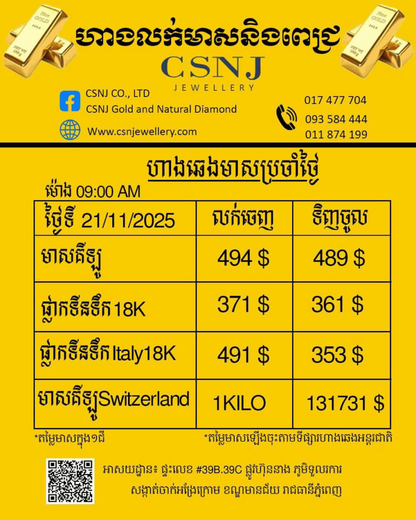 តម្លៃមាសនៅថ្ងៃទី២១ ខែវិច្ឆិកា ឆ្នាំ២០២៥នេះ បានធ្លាក់ថ្លៃបន្ដិចវិញហើយបើធៀបនឹងថ្ងៃម្សិលមិញ ពោលគឺមានតម្លៃ ៤៩៤ដុល្លារ នៅក្នុងមួយជី ជាតម្លៃលក់ចេញ និងទិញចូលក្នុងតម្លៃ ៤៨៩ដុល្លារ។ នេះបើយោងតាមហាងឆេងមាស ពីហាងមាសពេជ្រ CSNJ របស់លោកឧកញ៉ា ចិន សំណាង នាព្រឹក ម៉ោង៩:០០ នាទី ថ្ងៃទី២១ ខែវិច្ឆិកា។