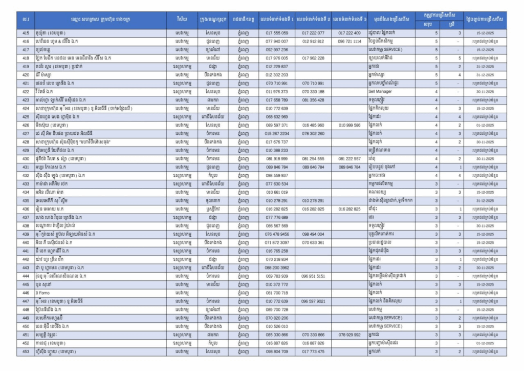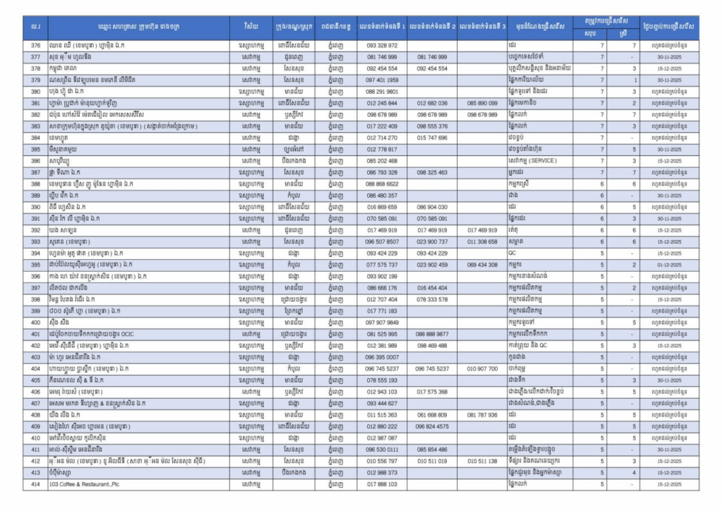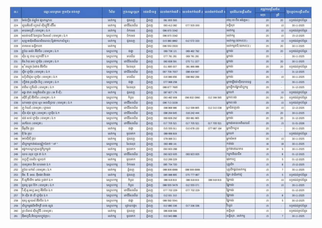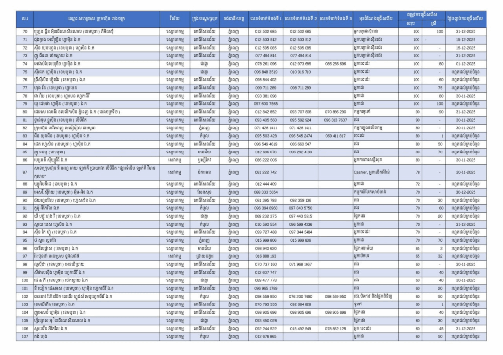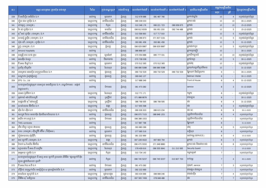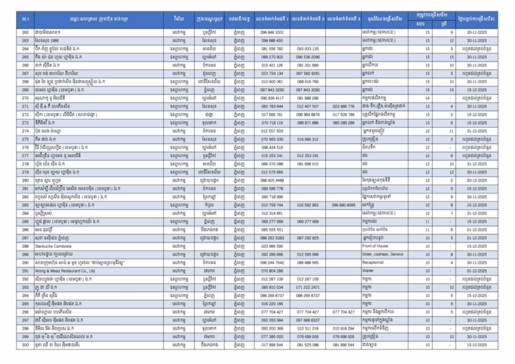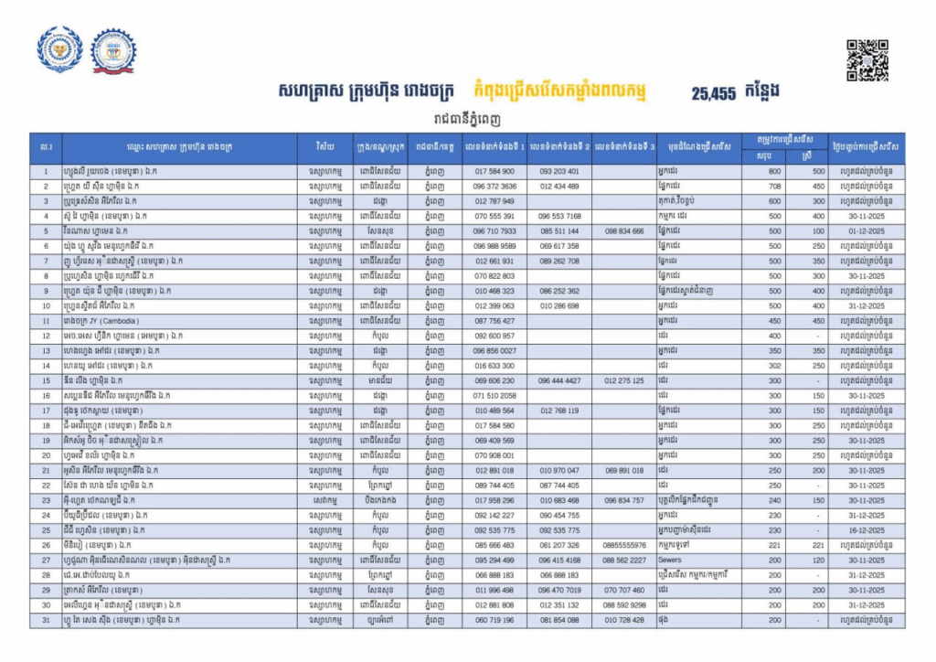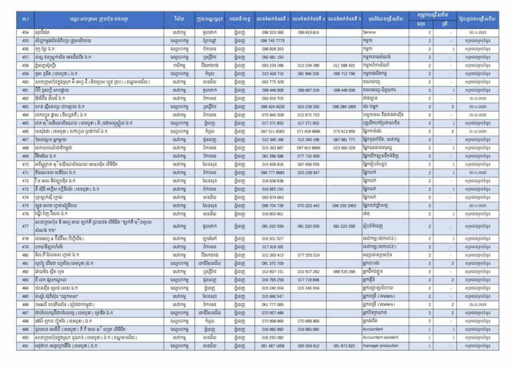តាមការបញ្ជាក់របស់ក្រសួងការងារ នៅថ្ងៃទី២២ ខែវិច្ឆិកា ឆ្នាំ២០២៥, ឱកាសការងារដែលក្រុមហ៊ុន សហគ្រាស រោងចក្រ ប្រកាសជ្រើសរើសមានដូចជា៖ ផ្នែកដេរ, បុគ្គលិកដឹកជញ្ជូន, កម្មករក្នុងផលិតកម្ម, យន្ដការីតម្លើងអគ្គិសនី, មន្រ្ដីឥណទាន និងប្រាក់កម្ចី, ជាងថែទាំរថយន្ដ, អ្នកការពារសន្ដិសុខ, Cashier, អ្នកលើកអីវ៉ាន់, កម្មករបំបែកសាច់មាន់, ផ្នែកអនាម័យ, អ្នកបើកបរ, ភ្នាក់ងារលក់ដីឡូត៍, ផ្នែកស្វាគមន៍ភ្ញៀវចូលតុ និងអ្នកបម្រើតាមស្ថានីយ៍ជាដើម។