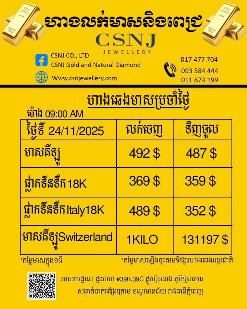 តម្លៃមាសនៅថ្ងៃទី២៤ ខែវិច្ឆិកា ឆ្នាំ២០២៥នេះ បានធ្លាក់ថ្លៃបន្ដិចវិញហើយបើធៀបនឹងចុងសប្ដាហ៍មុន ពោលគឺមានតម្លៃ ៤៩២ដុល្លារ នៅក្នុងមួយជី ជាតម្លៃលក់ចេញ និងទិញចូលក្នុងតម្លៃ ៤៨៧ដុល្លារ។ នេះបើយោងតាមហាងឆេងមាស ពីហាងមាសពេជ្រ CSNJ របស់លោកឧកញ៉ា ចិន សំណាង នាព្រឹក ម៉ោង៩:០០ នាទី ថ្ងៃទី២៤ ខែវិច្ឆិកា។