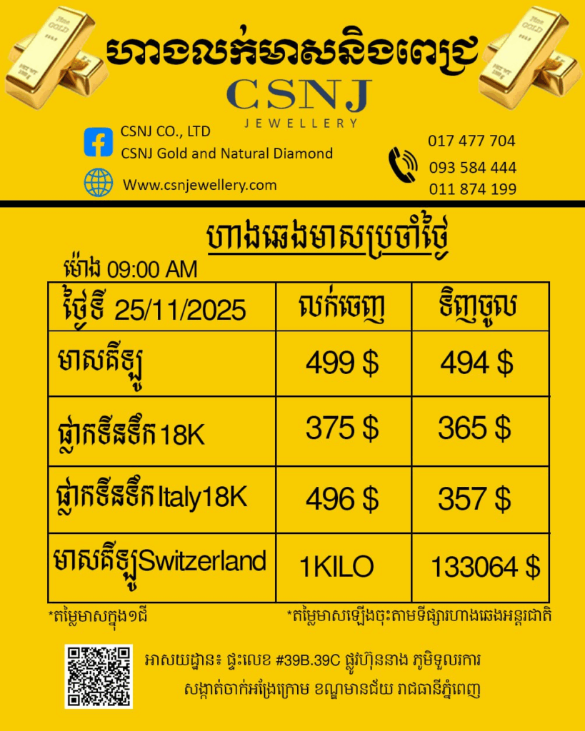តម្លៃមាសនៅថ្ងៃទី២៥ ខែវិច្ឆិកា ឆ្នាំ២០២៥នេះ បានហក់ឡើងខ្ពស់ខ្លាំងបើធៀបនឹងម្សិលមិញ ពោលគឺមានតម្លៃ ៤៩៩ដុល្លារ នៅក្នុងមួយជី ជាតម្លៃលក់ចេញ និងទិញចូលក្នុងតម្លៃ ៤៩៤ដុល្លារ។ នេះបើយោងតាមហាងឆេងមាស ពីហាងមាសពេជ្រ CSNJ របស់លោកឧកញ៉ា ចិន សំណាង នាព្រឹក ម៉ោង៩:០០ នាទី ថ្ងៃទី២៥ ខែវិច្ឆិកា។