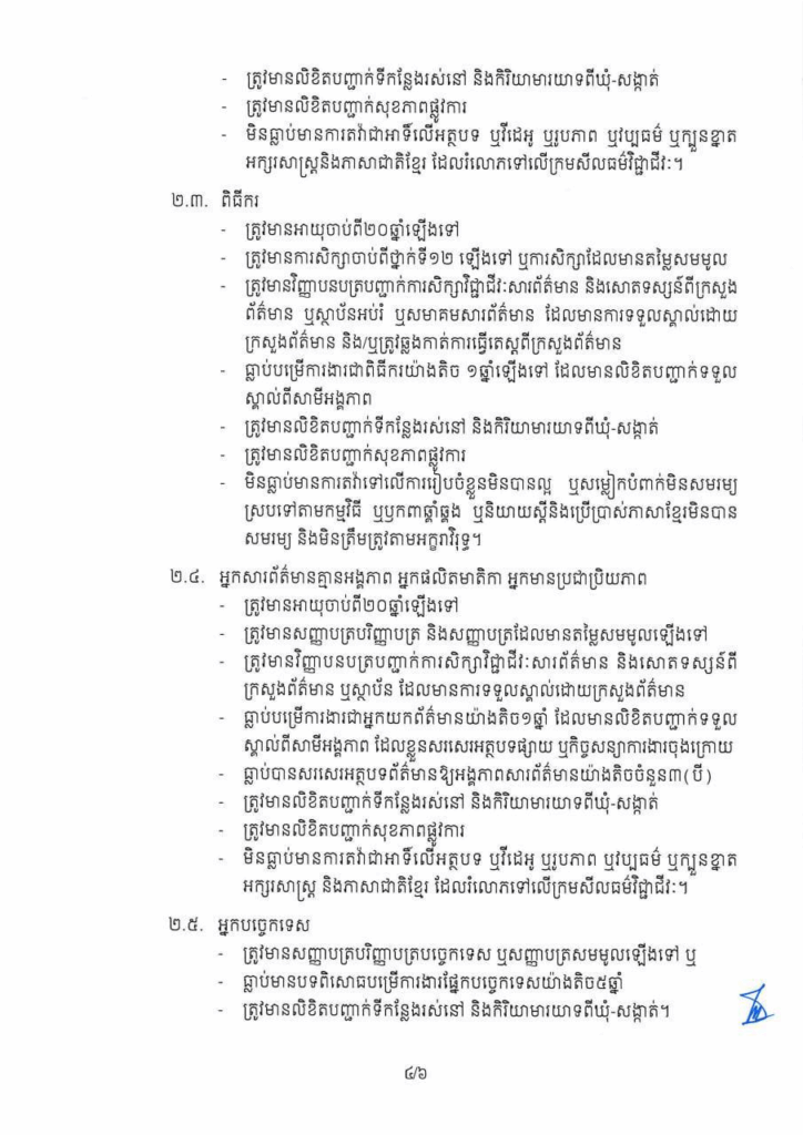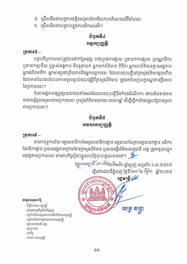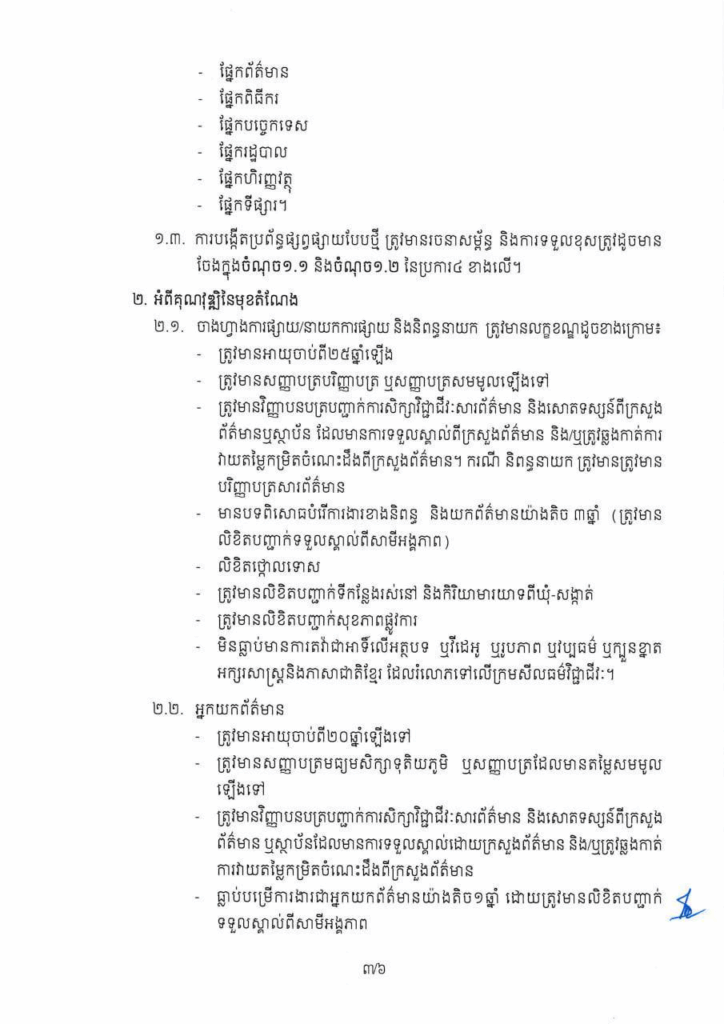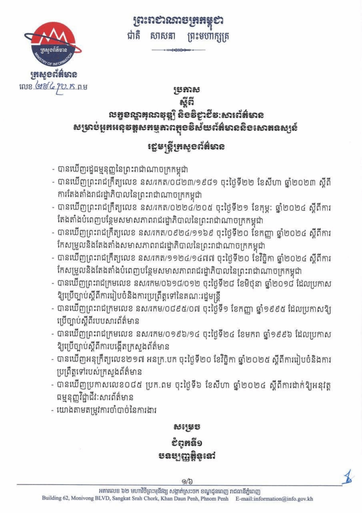ក្រសួងព័ត៌មាន នាថ្ងៃទី២៧ ខែវិច្ឆិកា ឆ្នាំ២០២៥នេះ បានចេញប្រកាស ស្តីពីលក្ខខណ្ឌគុណវុឌ្ឍិ និងវិជ្ជាជីវៈសារព័ត៌មានសម្រាប់អ្នកអនុវត្តសកម្មភាព​ក្នុងវិស័យ​ព័ត៌មាននិងសោតទស្សន៍។
