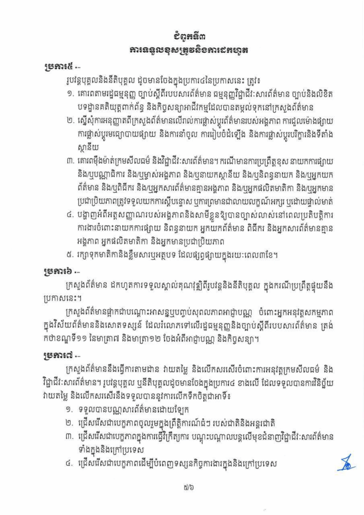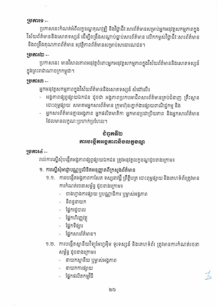 ក្រសួងព័ត៌មាន ចេញប្រកាសស្តីពីលក្ខខណ្ឌគុណវុឌ្ឍិ និងវិជ្ជាជីវៈសារព័ត៌មានសម្រាប់អ្នកអនុវត្តសកម្មភាព​ក្នុងវិស័យ​ព័ត៌មាននិងសោតទស្សន៍