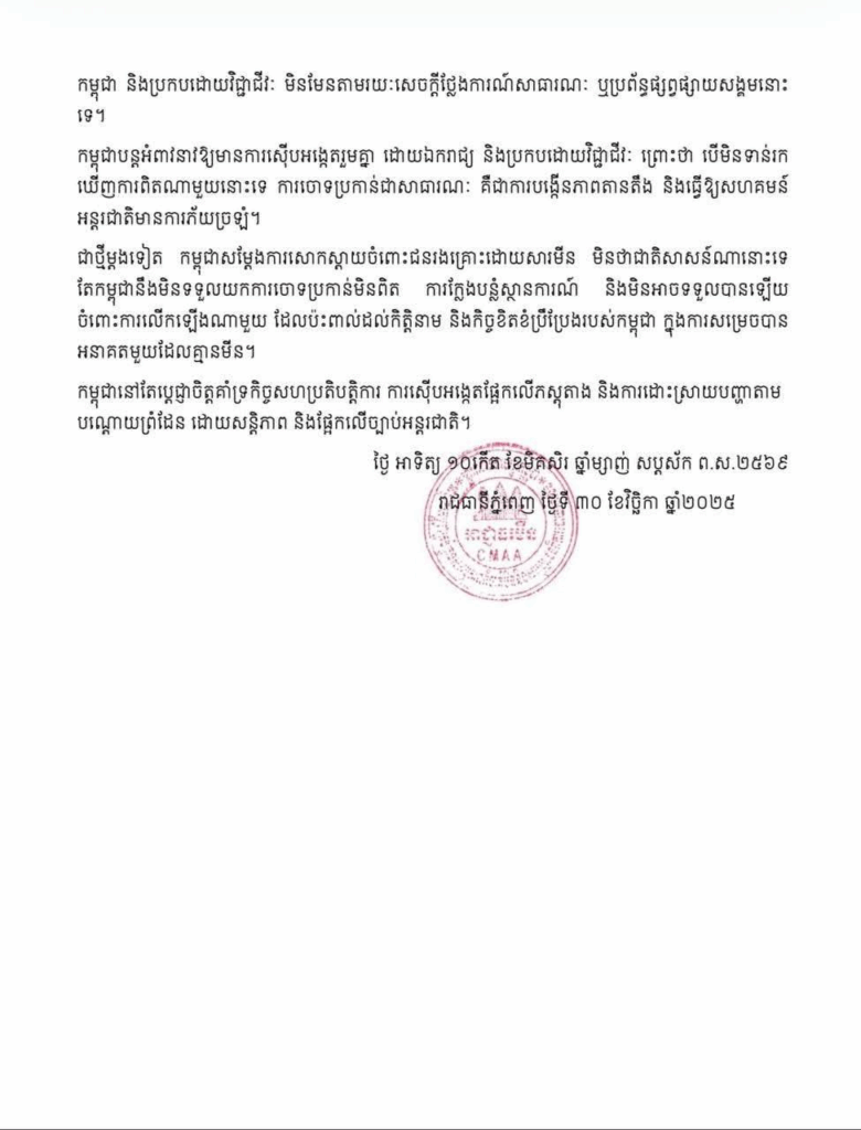 កម្ពុជានៅតែប្តេជ្ញាចិត្តគាំទ្រកិច្ចសហប្រតិបត្តិការ ការស៊ើបអង្កេតផ្អែកលើភស្តុតាង និងការដោះស្រាយបញ្ហាតាម បណ្ដោយព្រំដែន ដោយសន្តិភាព និងផ្អែកលើច្បាប់អន្តរជាតិ៕