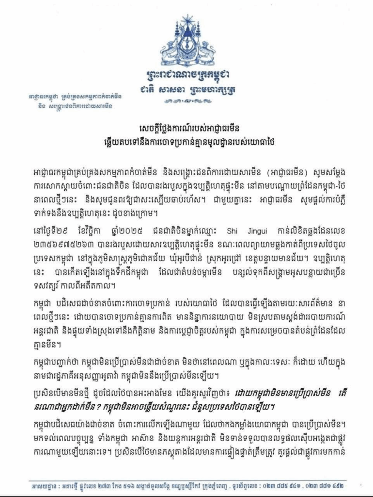 តាមរយៈសេចក្ដីថ្លែងការណ៍ចុះថ្ងៃទី៣០ ខែវិច្ឆិកា ឆ្នាំ២០២៥ អាជ្ញាធរមីន បានសម្ដែង ការសោកស្តាយចំពោះជនជាតិចិន ដែលបានរងរបួសក្នុងឧប្បត្តិហេតុផ្ទុះមីន នៅតាមបណ្ដោយព្រំដែនកម្ពុជា-ថៃ នាពេលថ្មីៗនេះ។