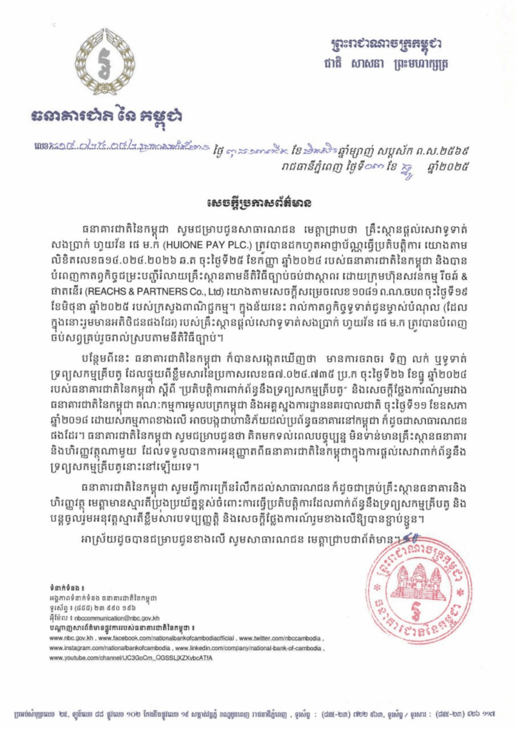 ធនាគារជាតិនៃកម្ពុជា នាថ្ងៃទី៣ ខែធ្នូ ឆ្នាំ២០២៥នេះ បានចេញសេចក្តីប្រកាសព័ត៌មាន ពាក់ព័ន្ធនឹងស្ថានភាពបច្ចុប្បន្នរបស់គ្រឹះស្ថានផ្ដល់សេវាទូទាត់សងប្រាក់ ហួយវ័ន ផេ ម.ក (HUIONE PAY PLC.)។