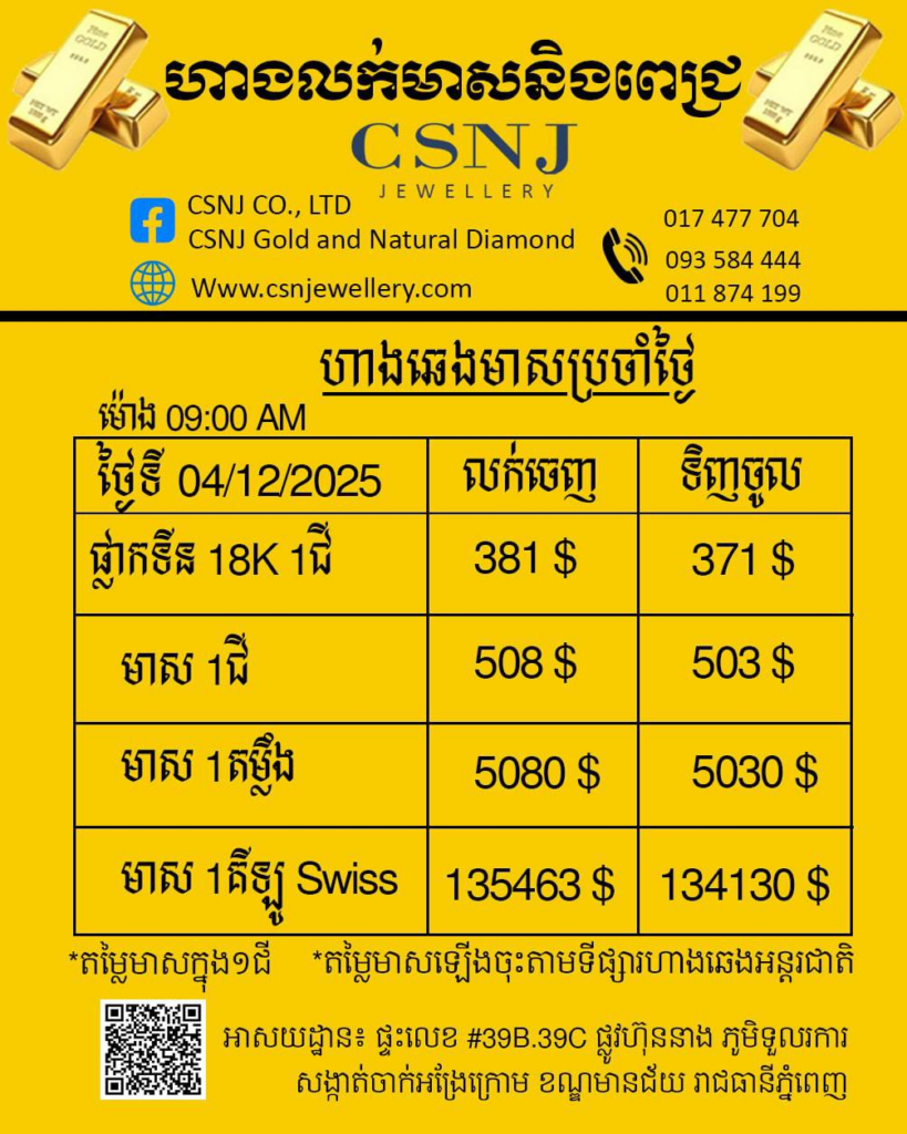 តម្លៃមាសនៅថ្ងៃទី៤ ខែធ្នូ ឆ្នាំ២០២៥នេះ បានធ្លាក់ថ្លៃបន្ដិចទៀតហើយ បើធៀបនឹងថ្ងៃម្សិលមិញ ពោលគឺមានតម្លៃ ៥០៨ដុល្លារ នៅក្នុងមួយជី ជាតម្លៃលក់ចេញ និងទិញចូលក្នុងតម្លៃ ៥០៣ដុល្លារ។ នេះបើយោងតាមហាងឆេងមាស ពីហាងមាសពេជ្រ CSNJ របស់លោកឧកញ៉ា ចិន សំណាង នាព្រឹក ម៉ោង៩:០០ នាទី ថ្ងៃទី៤ ខែធ្នូ។