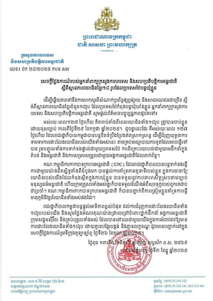 យោងតាមសេចក្ដីថ្លែងការណ៍ របស់ក្រសួងការបរទេស នៅថ្ងៃទី៣ ខែធ្នូ ឆ្នាំ២០២៥ បានឱ្យដឹងថា អស់រយៈពេល១២៧ ថ្ងៃហើយ គិតចាប់តាំងពីពេលយោធិនទាំង១៨រូប ត្រូវបានចាប់ខ្លួន ដោយខុសច្បាប់ កាលពីថ្ងៃទី២៩ ខែកក្កដា ឆ្នាំ២០២៥។ ដូចគ្នានេះដែរ គឺអស់រយៈពេល ១២៧ ថ្ងៃហើយ ដែលរាជរដ្ឋាភិបាលកម្ពុជាបានបន្តខិតខំប្រឹងប្រែងឥតស្រាកស្រាន្ត ដើម្បីជំរុញយុទ្ធនាការ ទាមទារការដោះលែងយោធិនរបស់យើងទាំងអស់នេះ តាមគ្រប់មធ្យោបាយការទូតដែលអាចធ្វើទៅ បាន រួមបញ្ចូលទាំងការទាក់ទងផ្ទាល់ជាមួយប្រទេសថៃ ការពិគ្រោះយោបល់ជាមួយមេដឹកនាំក្នុង តំបន់ និងអន្តរជាតិ និងការសម្របសម្រួលជាមួយអង្គការអន្តរជាតិដែលពាក់ព័ន្ធ។
